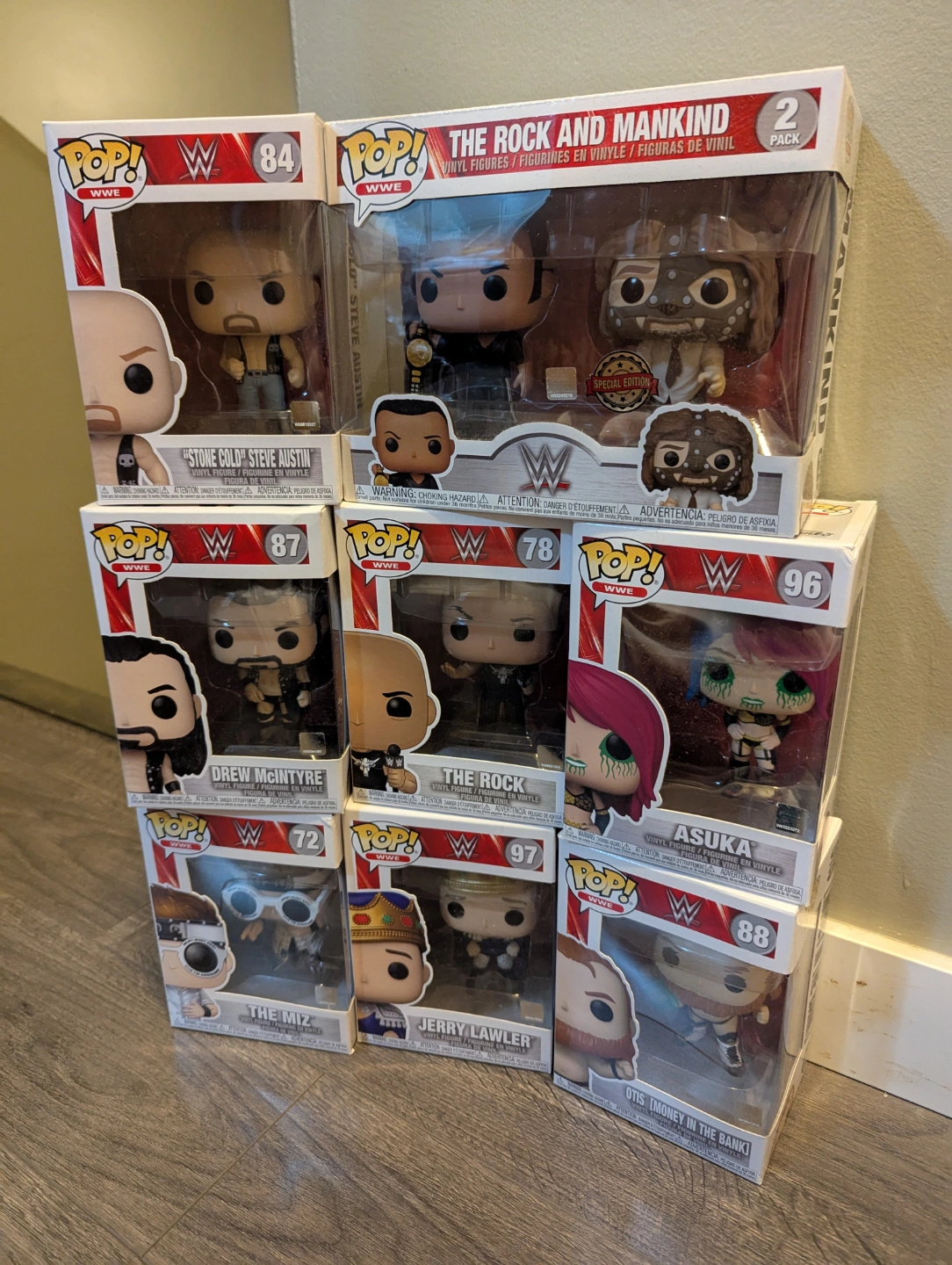 Collection of WWE Funko Pop! vinyl figures. Includes Stone Cold Steve Austin, The Rock and Mankind 2 pack, The Rock, Drew McIntyre, Asuka, The Miz, Jerry Lawler, and Otis. Figures are in their original boxes. Great for collectors!
