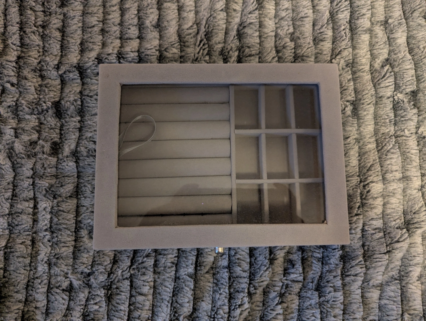 Organized storage for rings and other small jewellery. Grey velvet exterior. Multiple compartments for earrings and other trinkets. Great for keeping jewellery safe and organized.