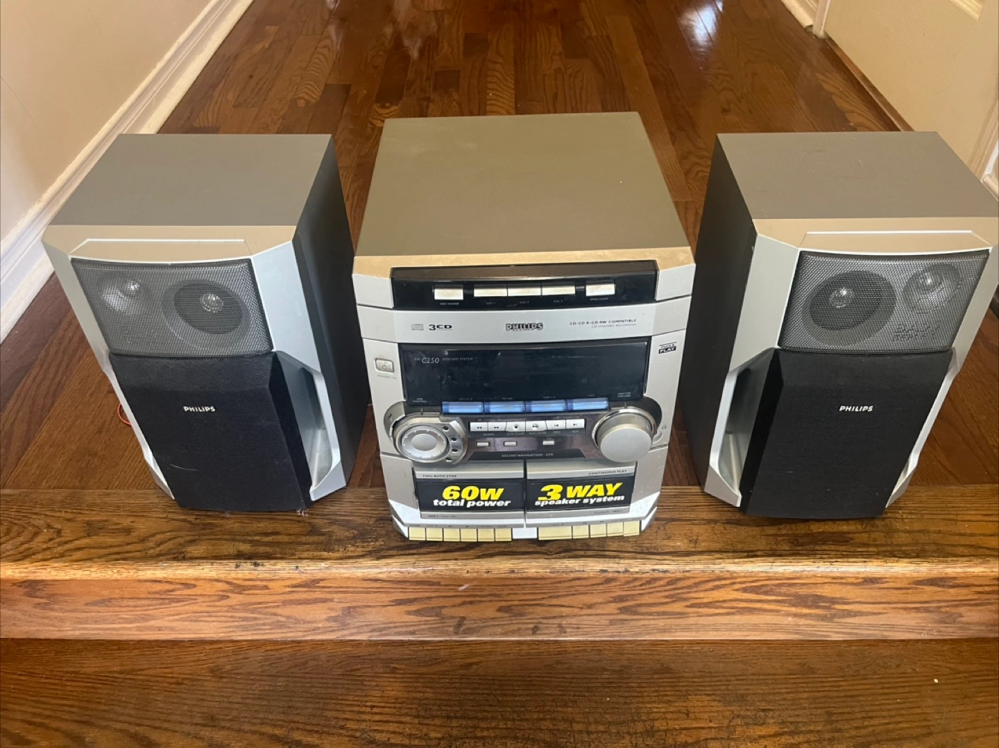 Philips stereo system. Three-piece system. Includes two speakers and a main unit. CD and radio capabilities. 60W total power.