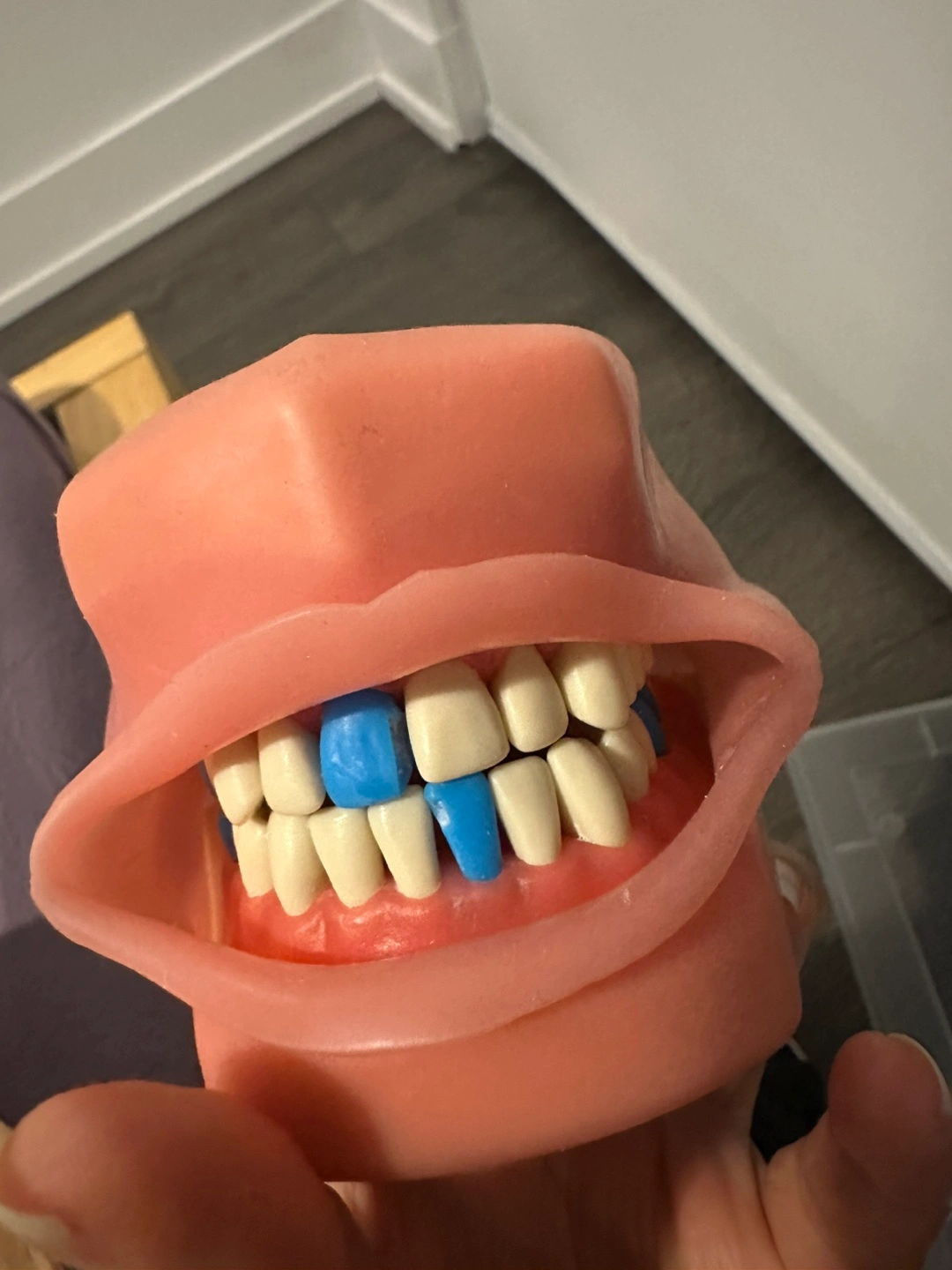 Used dental model. Features realistic teeth and gums. Includes blue coloured teeth and natural coloured teeth. Great for educational purposes.