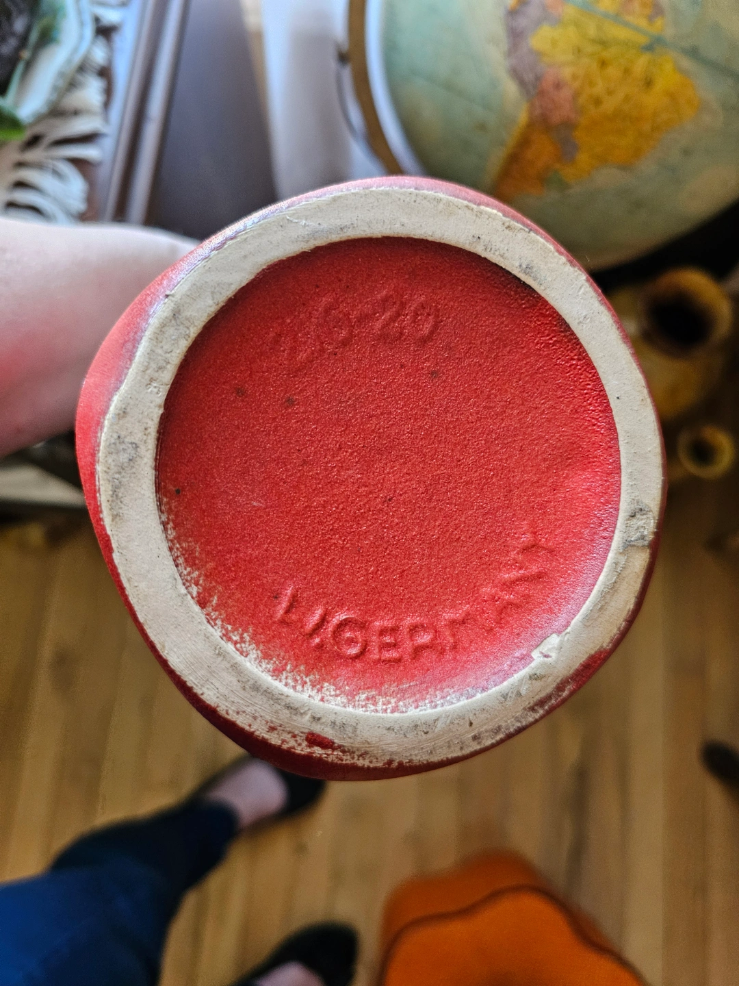 Unique red and brown speckled ceramic vase. Mid-century modern design. Excellent for displaying pussywillows or used as a decorative accent. Shows minor wear consistent with age.
