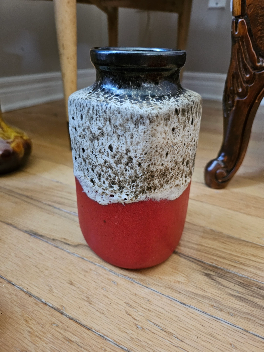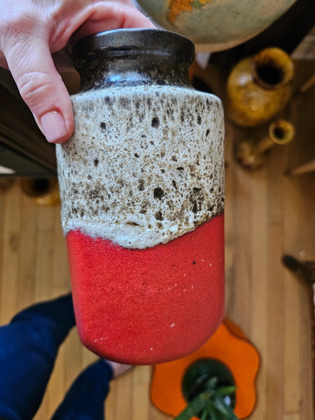 Unique red and brown speckled ceramic vase. Mid-century modern design. Excellent for displaying pussywillows or used as a decorative accent. Shows minor wear consistent with age.