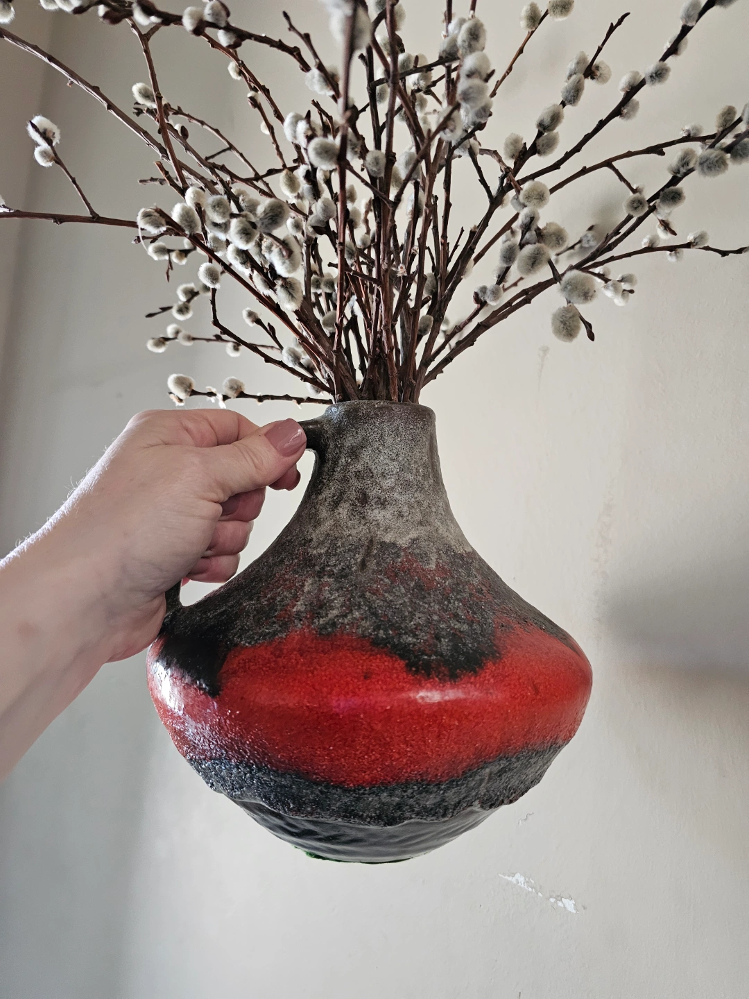 Unique mid-century modern vase. Red and black speckled glaze. Features a handle. Excellent for displaying dried flowers or used as a decorative accent.