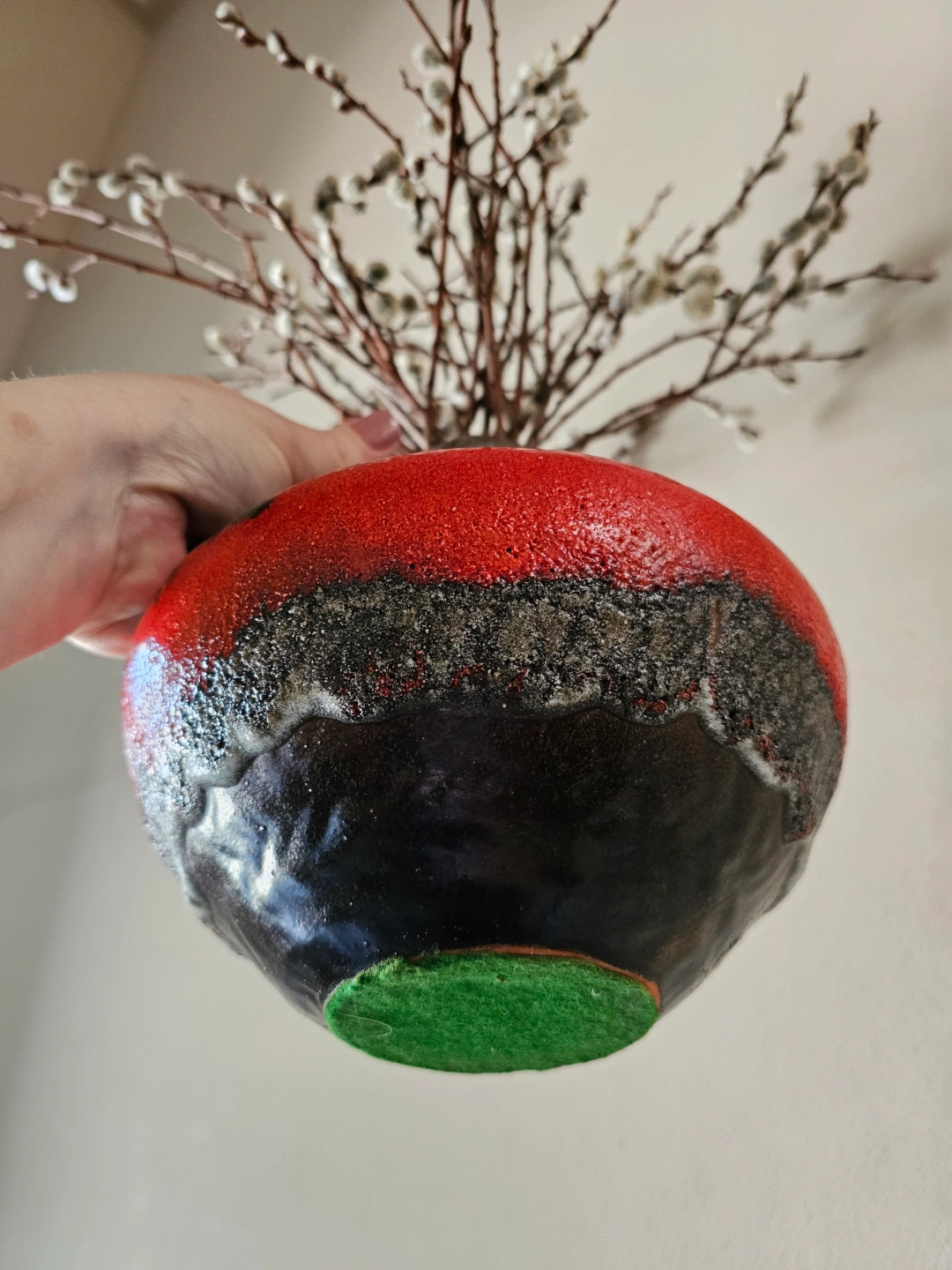 Unique mid-century modern vase. Red and black speckled glaze. Features a handle. Excellent for displaying dried flowers or used as a decorative accent.