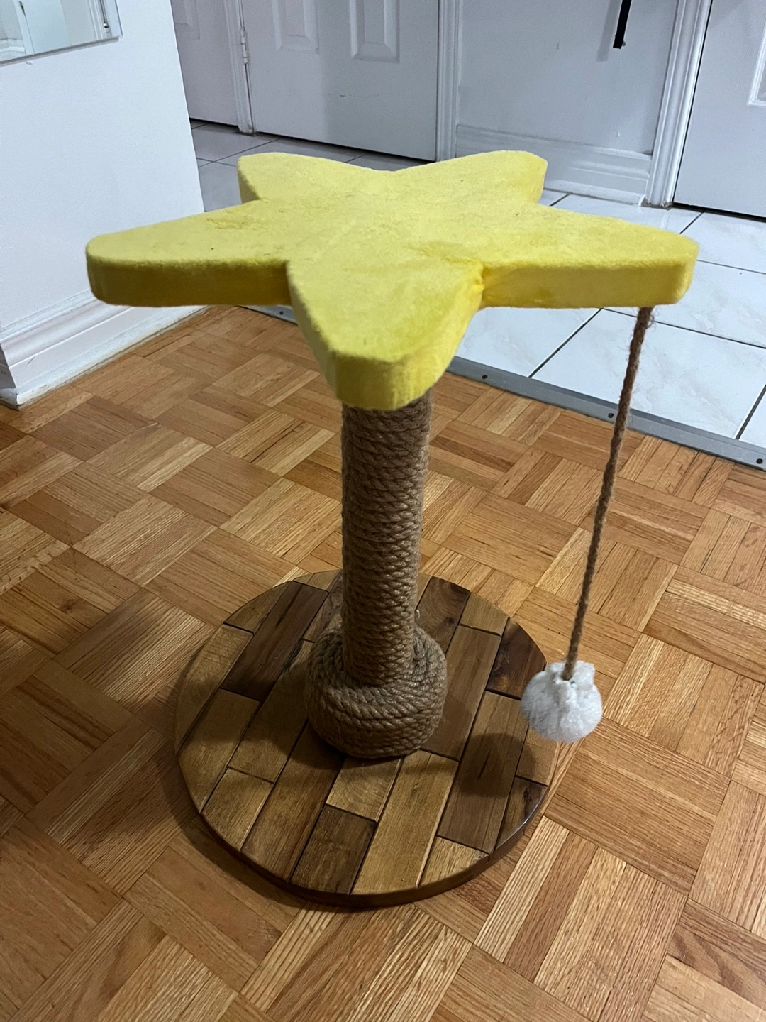 A star-shaped top perch, sisal rope post, and a wooden base. Includes a dangling toy. Perfect for playful kittens or cats.