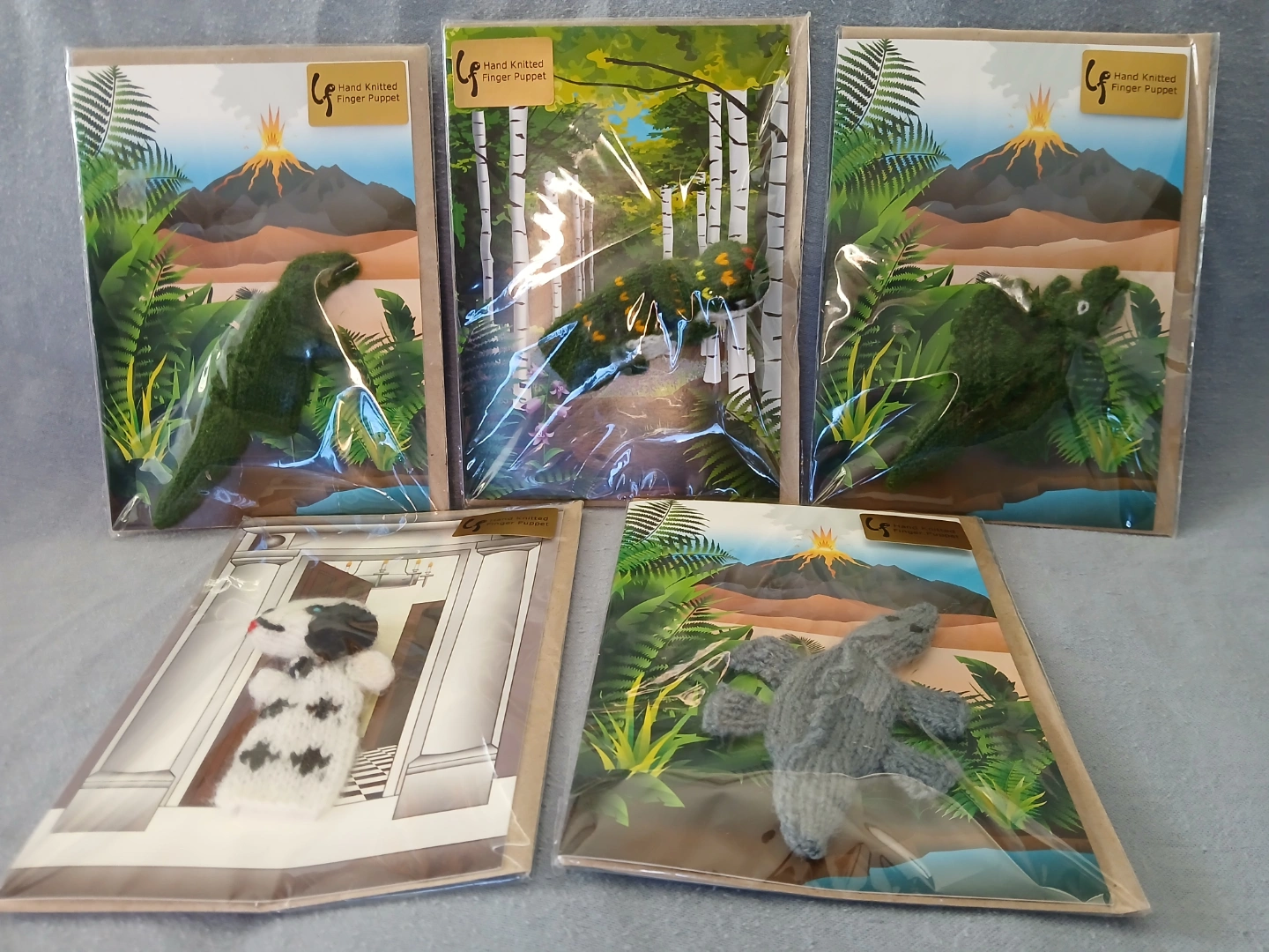 Five hand-knitted finger puppets. Adorable designs. Perfect for kids or collectors. From a smoke-free, pet free home.