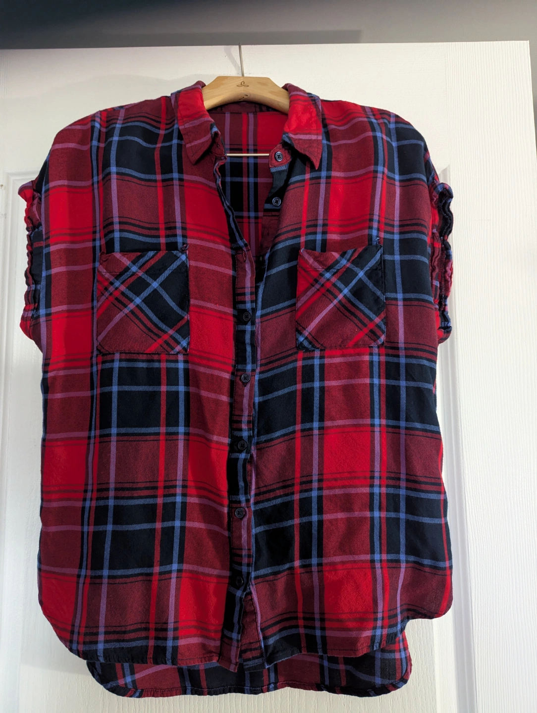 Women's sleeveless button-down shirt. Features a red, black, and blue plaid pattern. Two chest pockets. Curved hem.