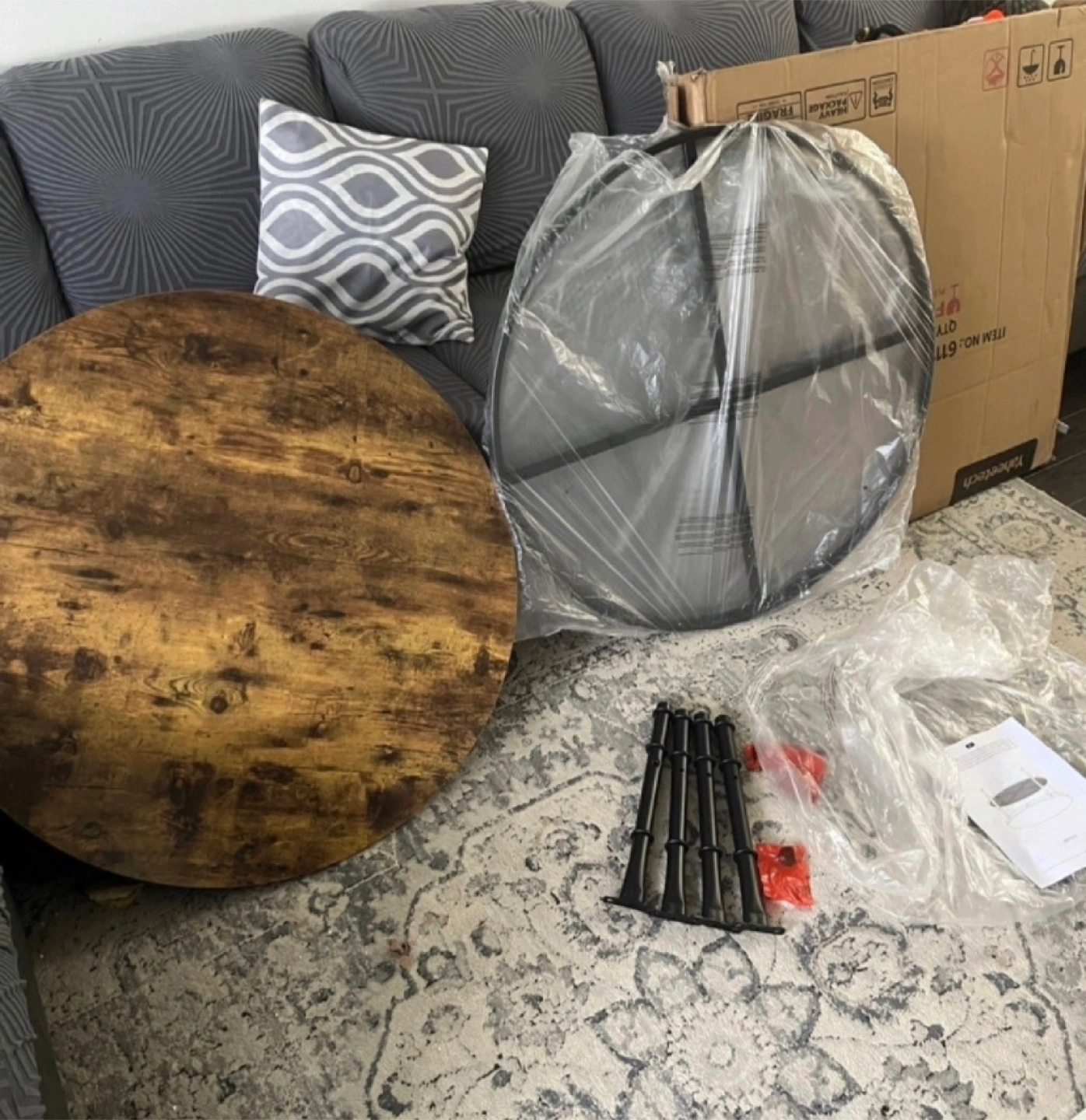 Round coffee table. Features a rustic brown wood top and a lower metal shelf. Sturdy black metal legs. Great for living rooms or apartments.