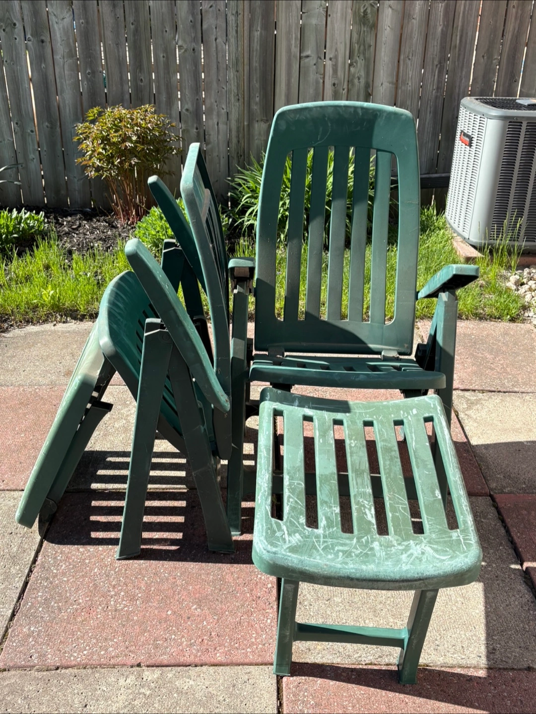 Buy & SellFolding patio chairs & ottomanFolding patio chairs & ottomanFreeSet of two folding resin patio chairs and a matching ottoman. Green colour. Shows some wear.ConditionOkayWHERE TO MEETEast YorkView MapSELLERRaynaDanforth E York472 reviews3 chats·2 favorites·147 views