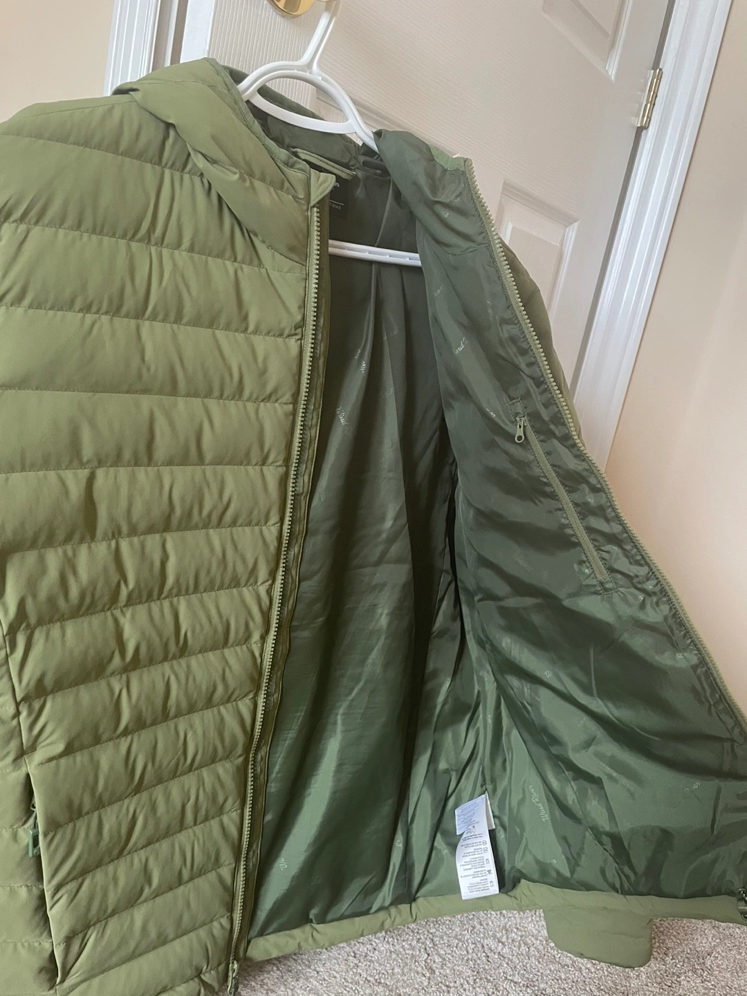 This item has no wear or tear, and has very minimal stains (shown in the photos). It features HYPER-DRI® HD1 technology, allowing it to become water repellent, and has T-MAX® SPHERE insulation, allowing for the retention of warmth. This jacket will keep you comfortable to a windchill factor of around -15 °C (varies by activity and layering). The material of this item can be found in the 4th photo.