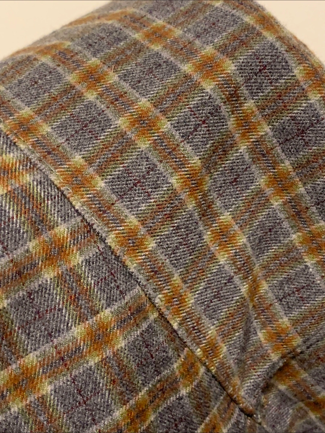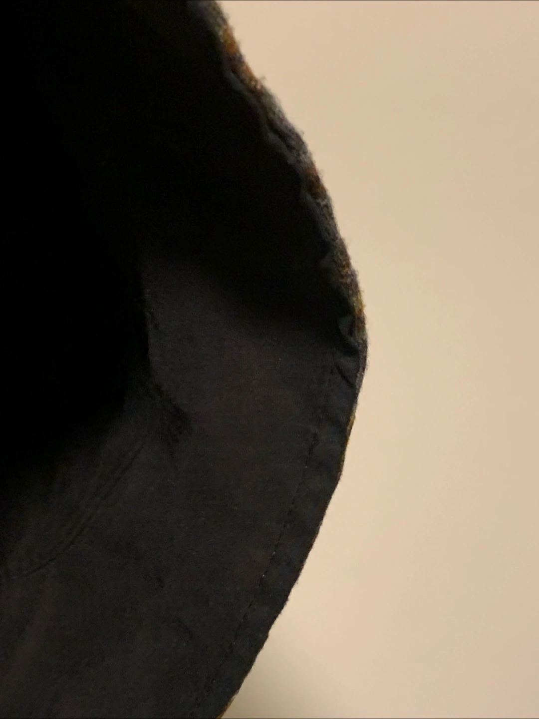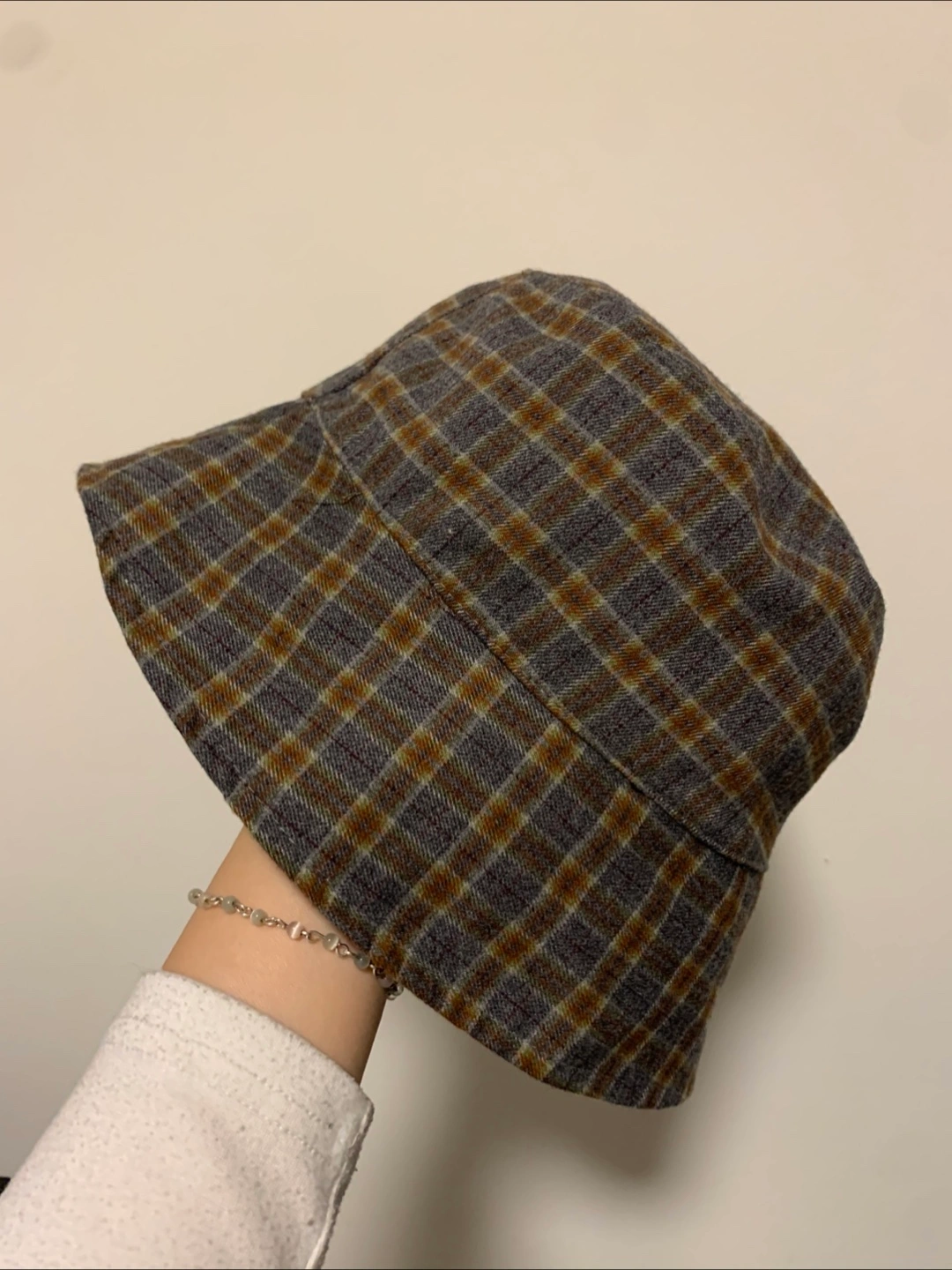 Cute bucket hat. Grey, brown, and beige plaid pattern. Soft material. Great for fall or winter.