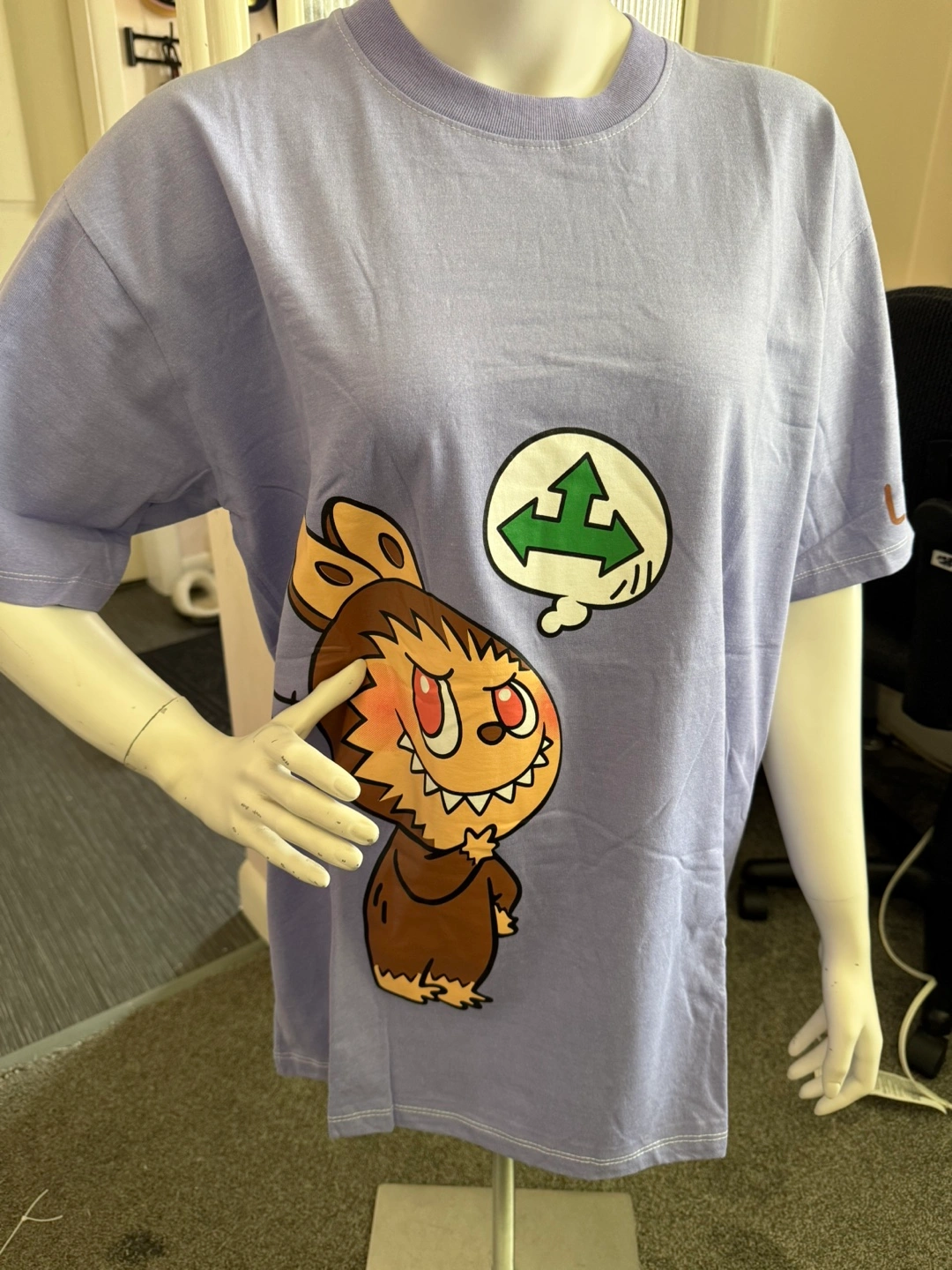Adorable The monsters Labubu purple t-shirt. Features unique cartoon character design. Front and back prints. Short sleeves. Relaxed fit. Pure thick cotton. Pick up at Weston.