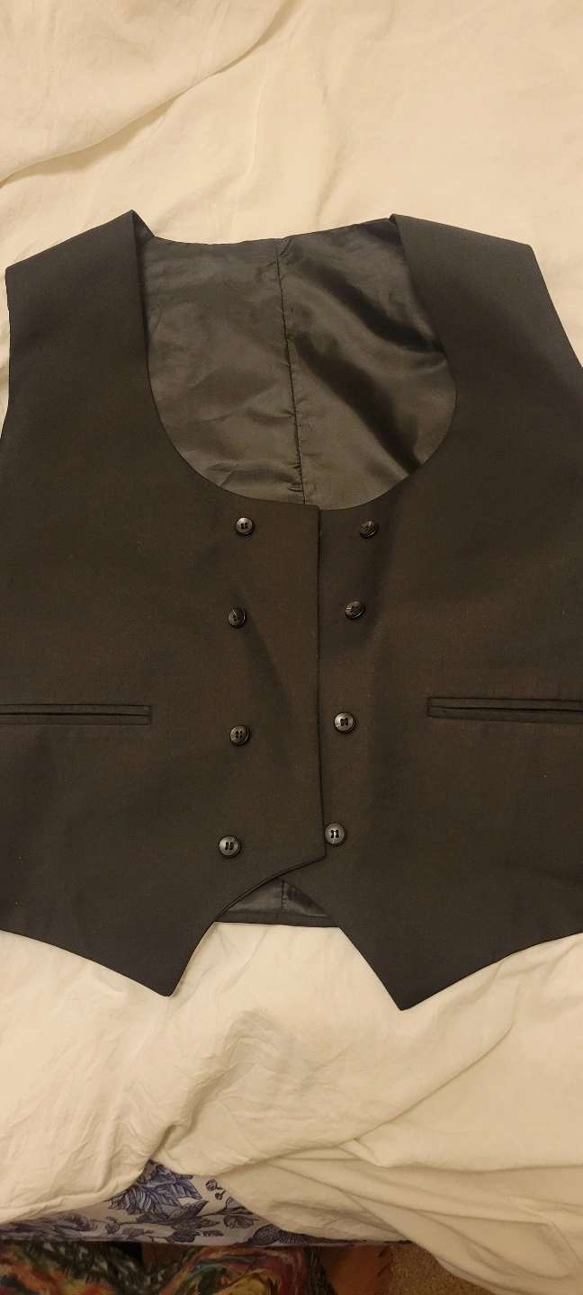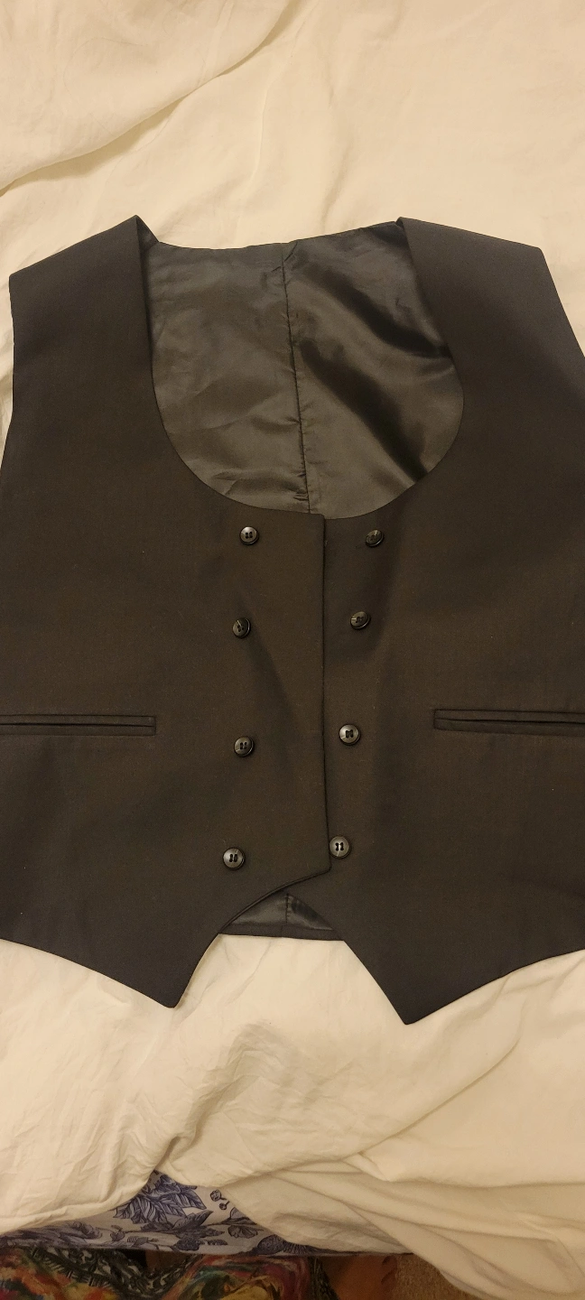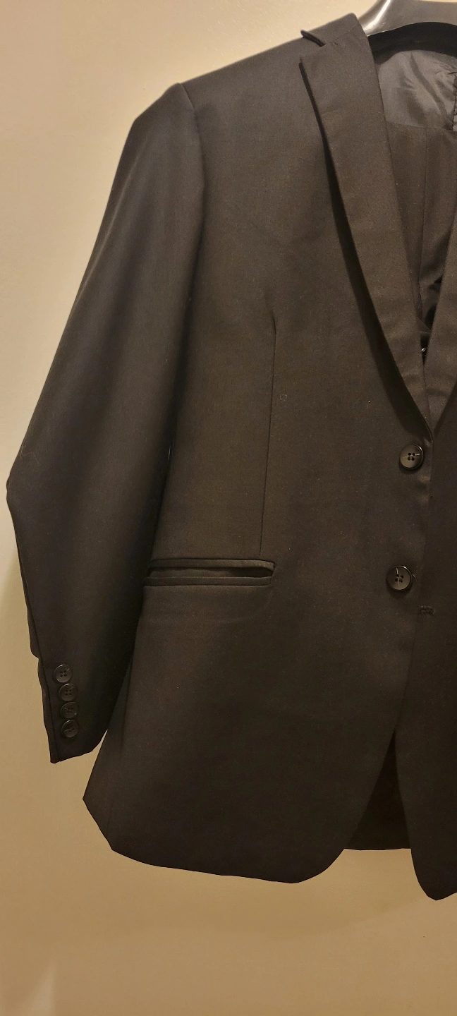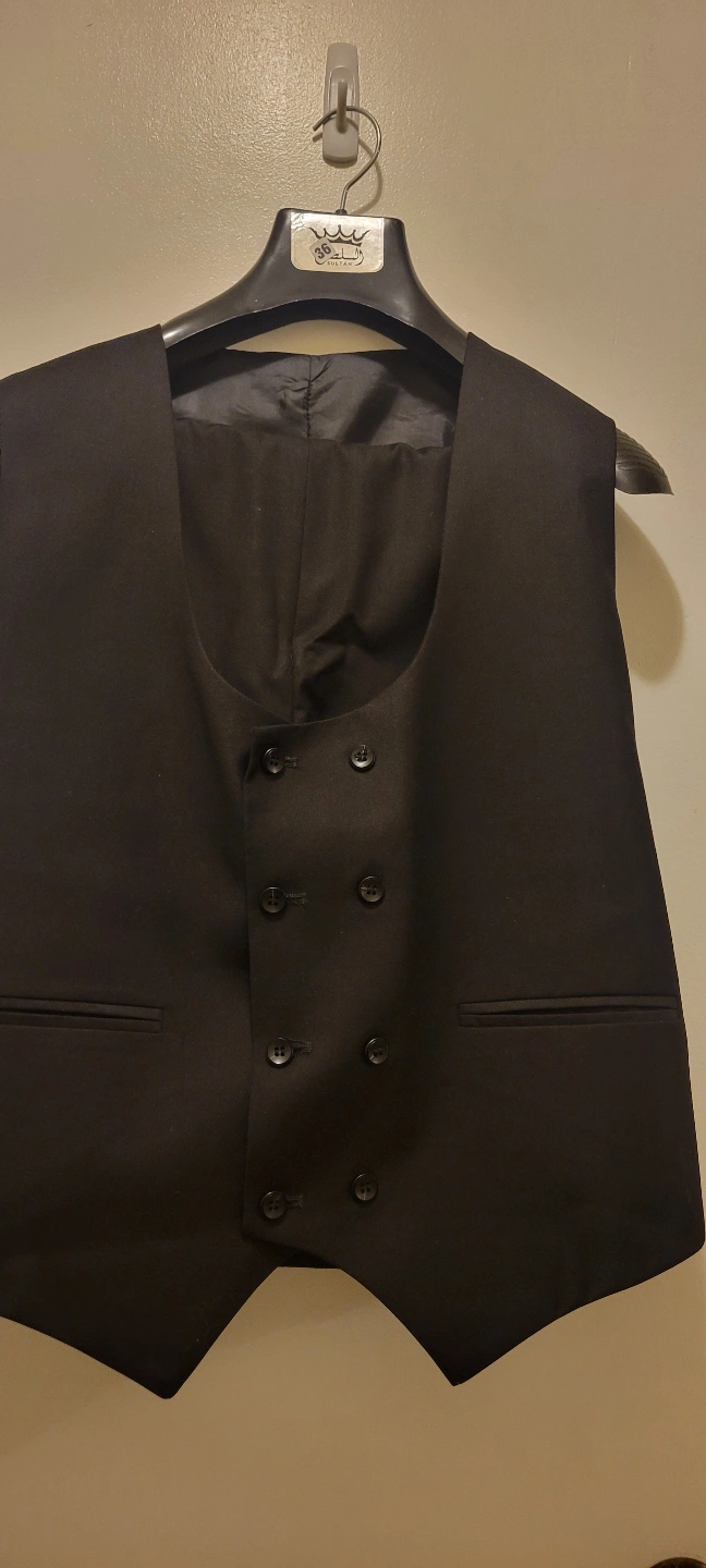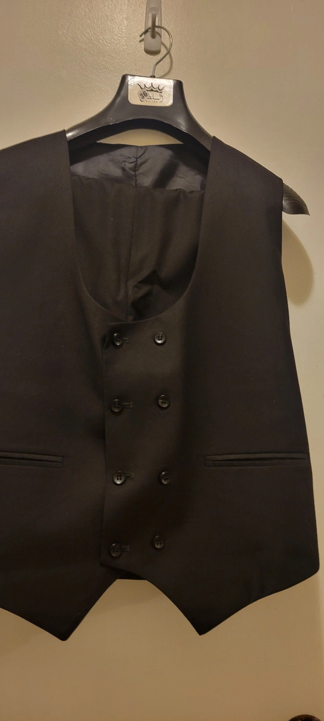 Black three-piece suit. Includes jacket, vest, and trousers. Classic style. Double-breasted vest. Single-breasted jacket. Great for formal occasions
