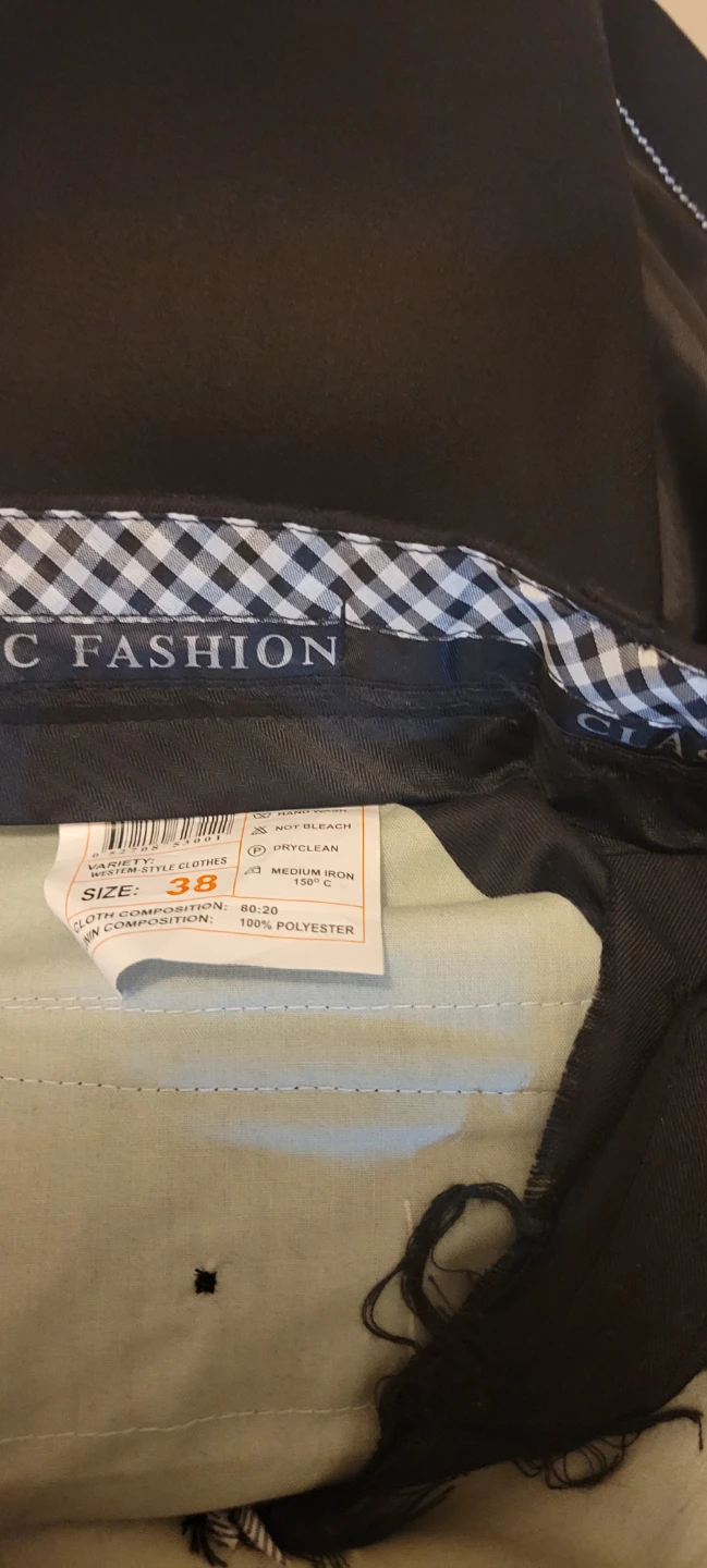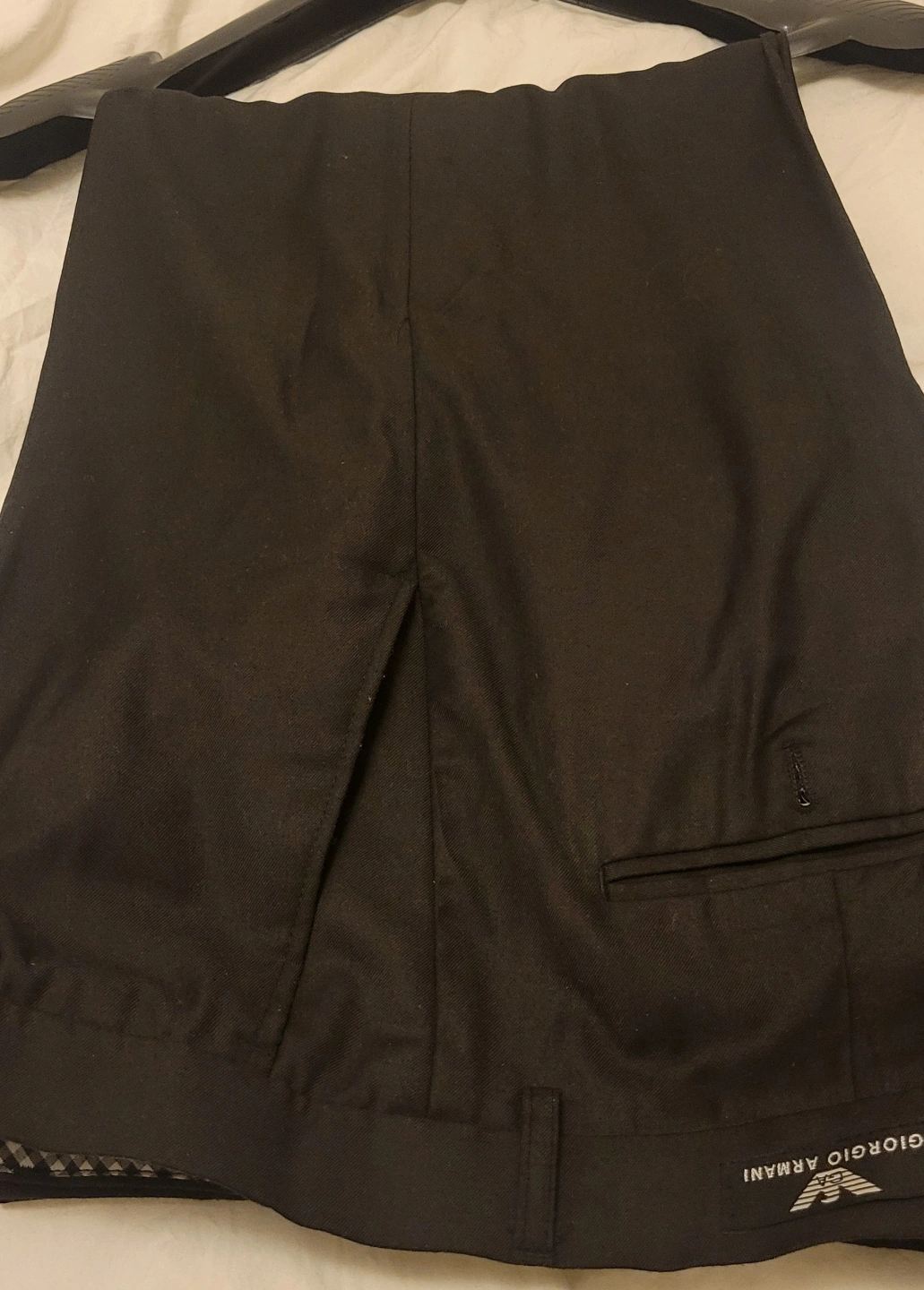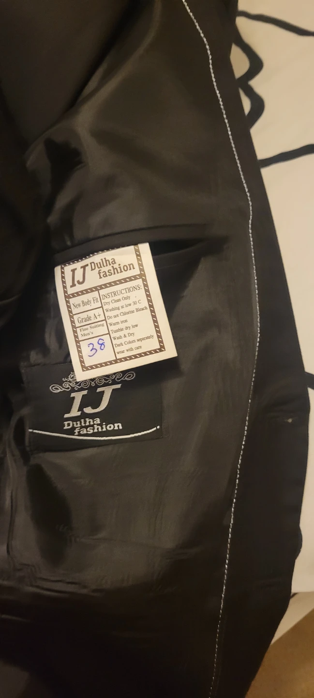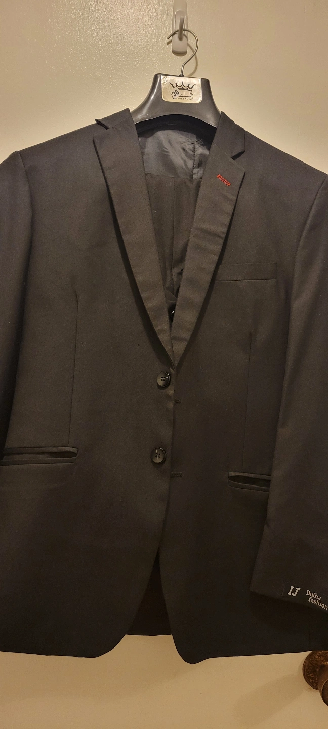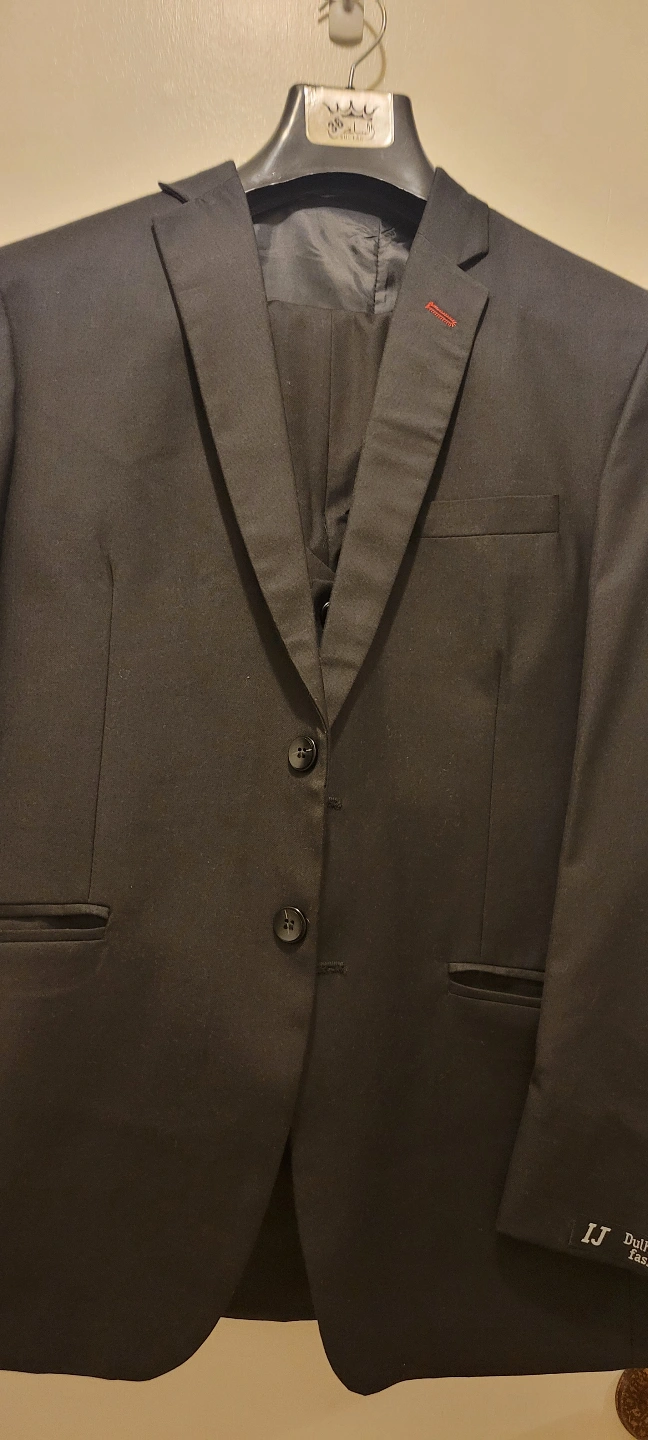 Black three-piece suit. Includes jacket, vest, and trousers. Classic style. Double-breasted vest. Single-breasted jacket. Great for formal occasions