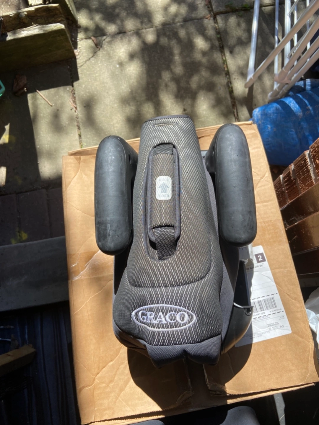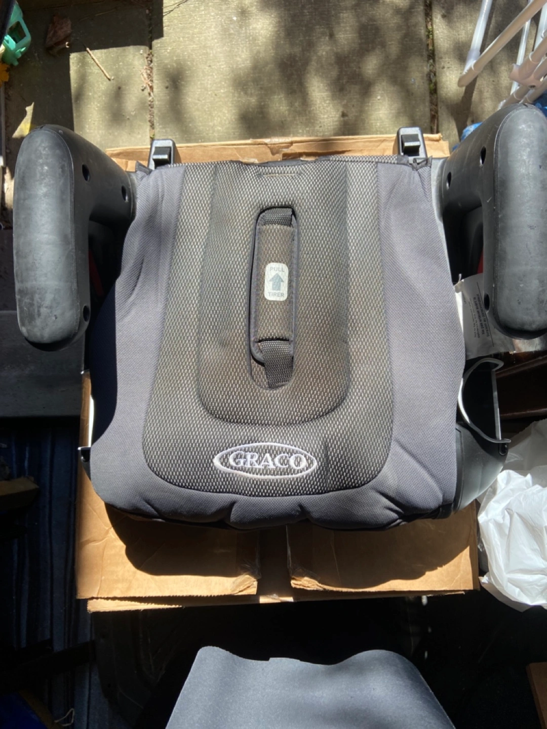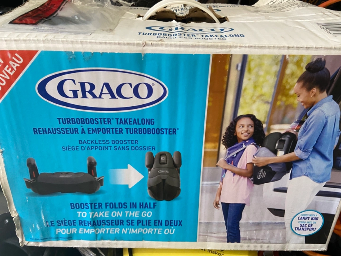 Used Graco Turbobooster Takeaalong backless booster seat. Folds in half for easy storage. Shows some wear. Washable cover need to be clean because of the storage