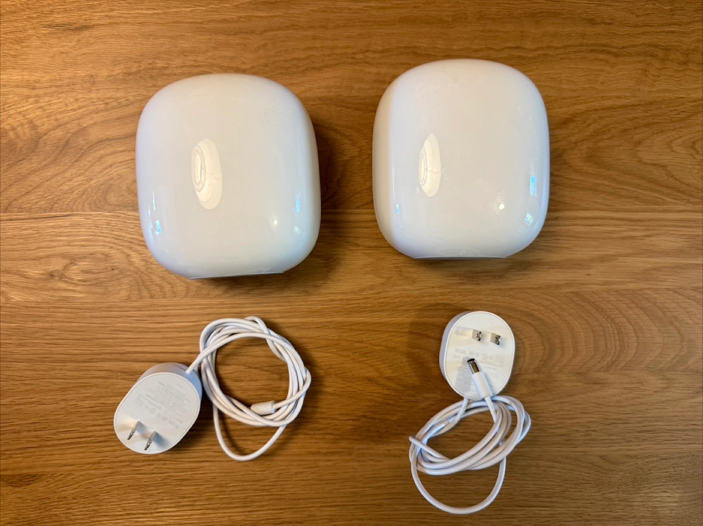 Google Nest Wifi Pro 6e mesh wifi system. Two-pack. Snow color. Includes power adapters. Great for home networking.