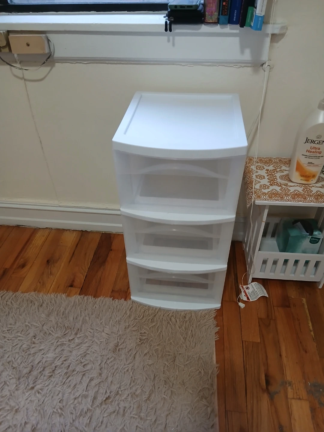 I'm selling a white storage tower with three drawers! It's perfect for organizing clothes, toys, or anything else you need to store. It's in great condition and ready for a new home