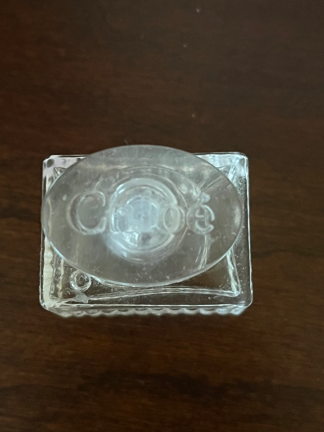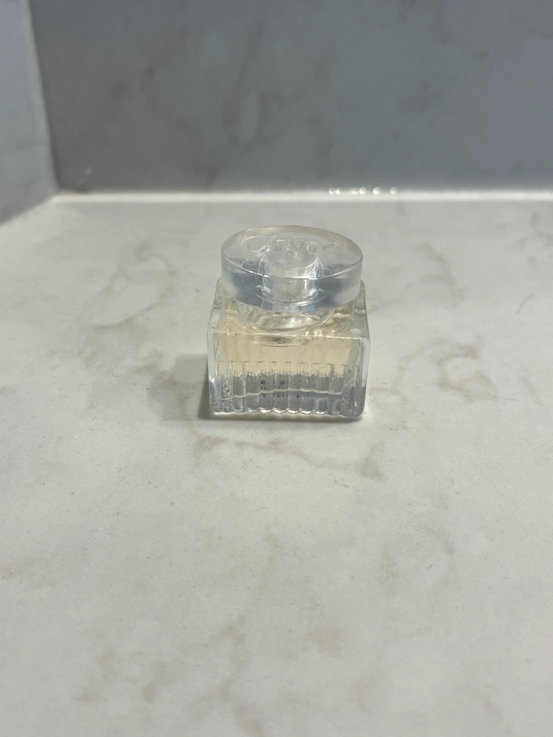 Small Chloé perfume bottle. Clear glass square bottle with ribbed sides. Transparent cap. Great for travel or a collection.