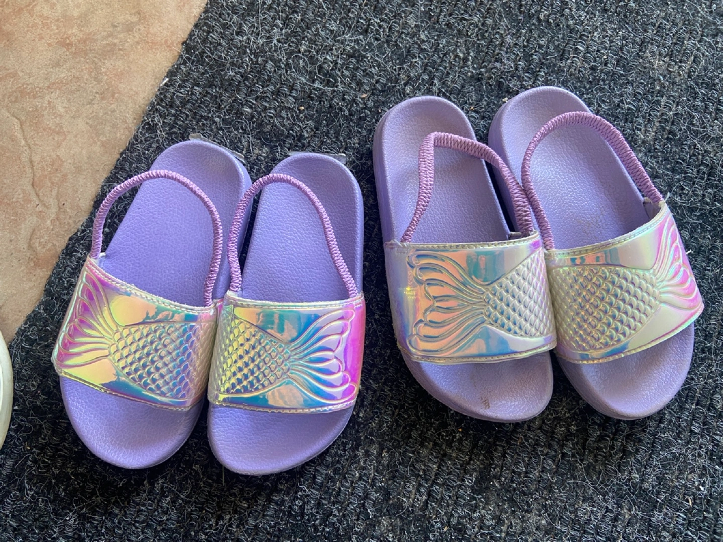 Two pairs of girls' slides. Purple with iridescent mermaid scale design. Size 9/10 and 11/12. Great for summer.