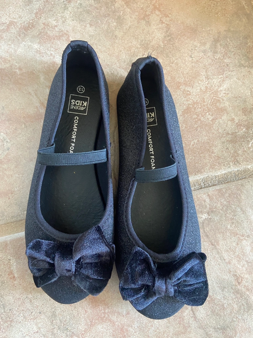 Adorable black glitter Mary Jane shoes. Velvet bow accents. Comfort foam insoles. Excellent for special occasions or everyday wear. Size 13.