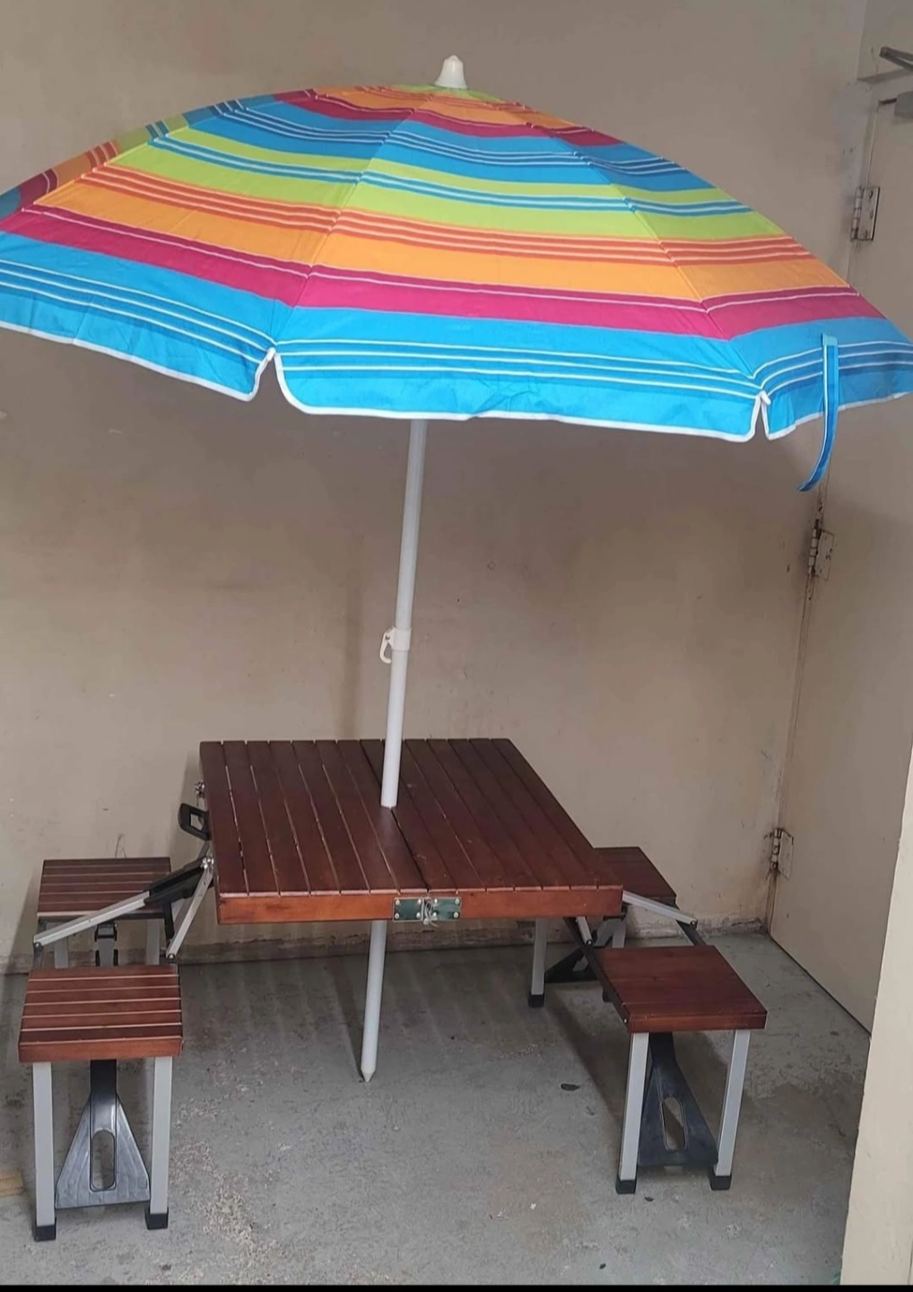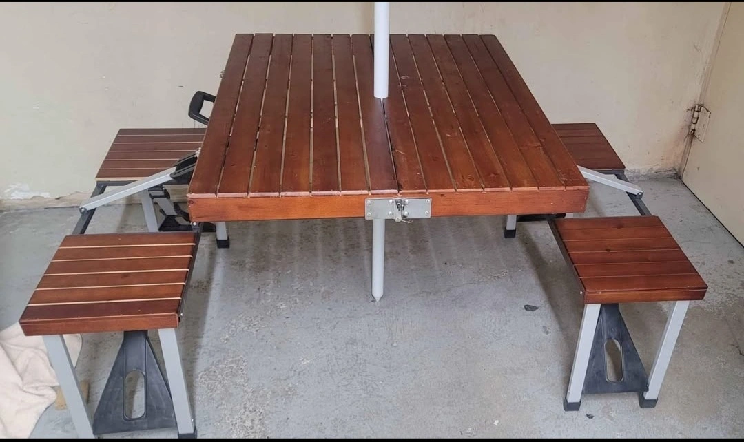 Foldable picnic table with four attached benches. Brown wooden top and grey metal frame. Includes a colourful striped patio umbrella. Convenient carrying case. Perfect for outdoor events.