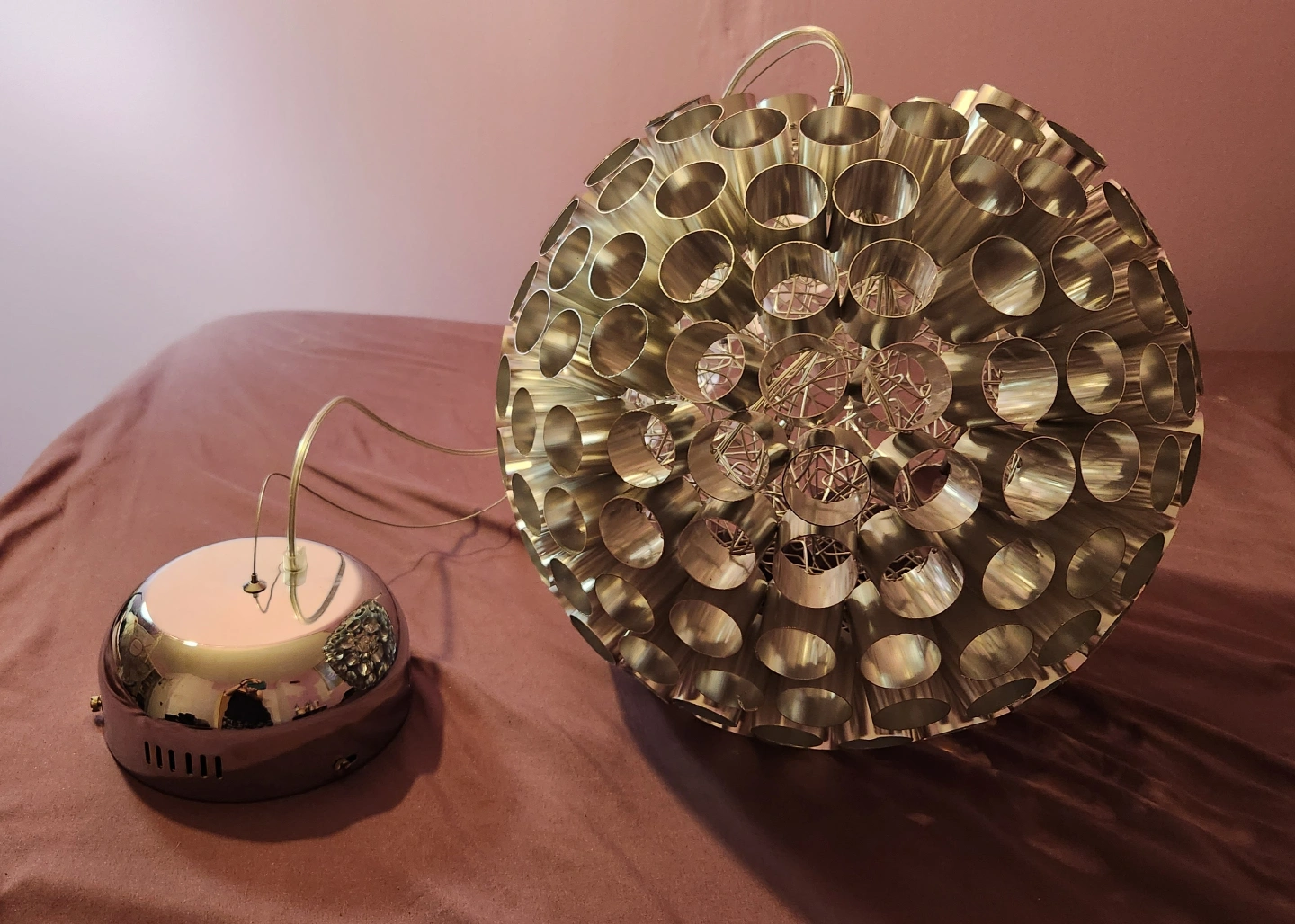 Stunning contemporary pendant light. Metal construction. Multiple small cylindrical shades. Unique design. Adds a touch of modern elegance to any space. Includes ceiling mount.
