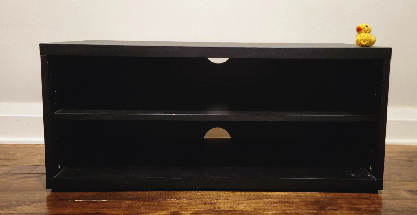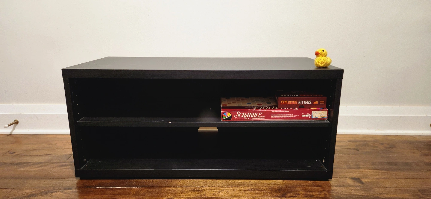 Simple black TV stand with two shelves. Cable management cutouts in each shelf section. It can be used as a pet sleeping area, bookshelf, boardgames shelf, or even an electronic storage solution.
