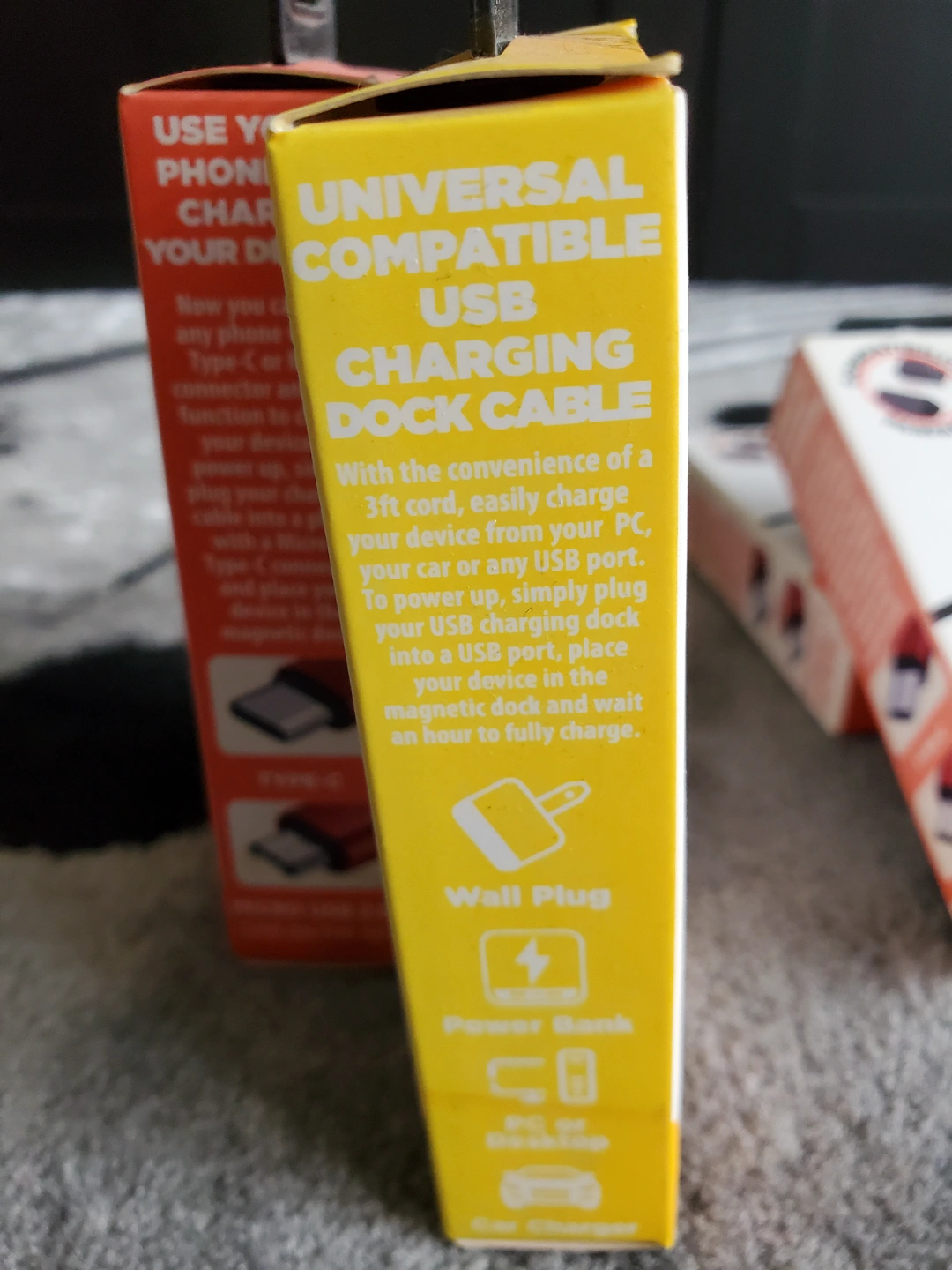 Brand new, sealed in box. 3ft long cable. Charges your device from your PC, car or any USB port. Universal compatibility.New, in original packaging. 50 cents her box, or 25 cents each for more than 2. 8 boxes left.