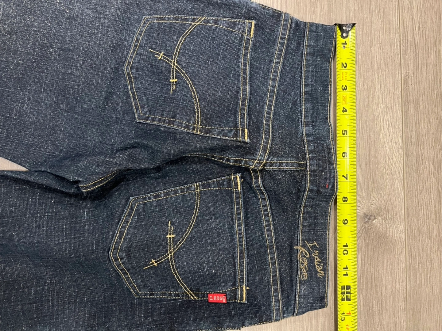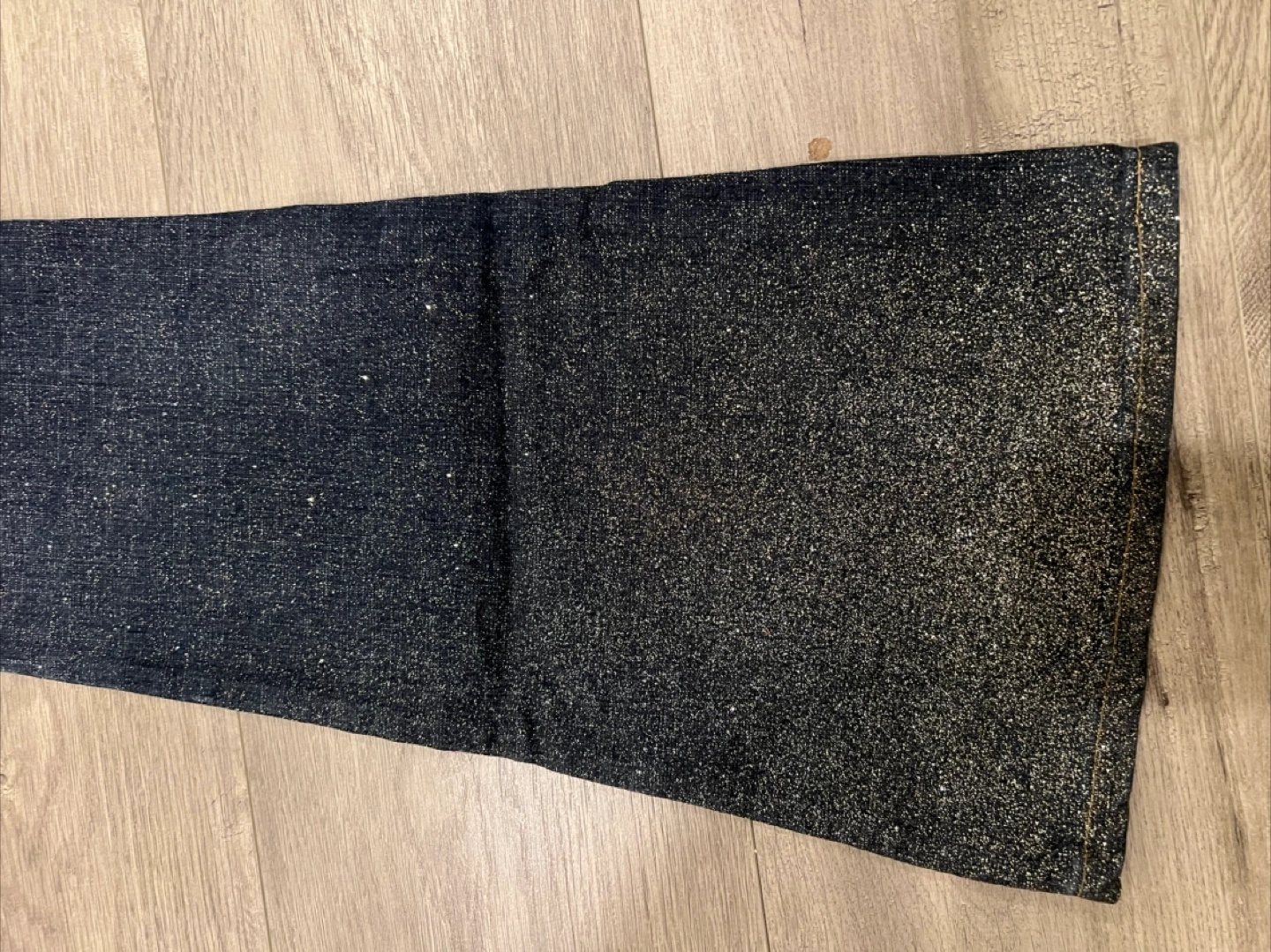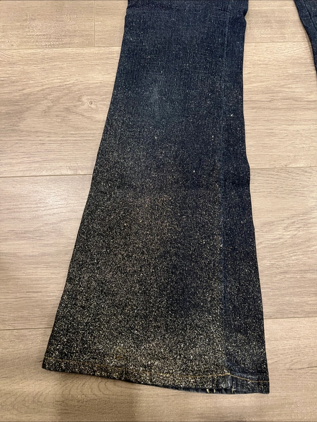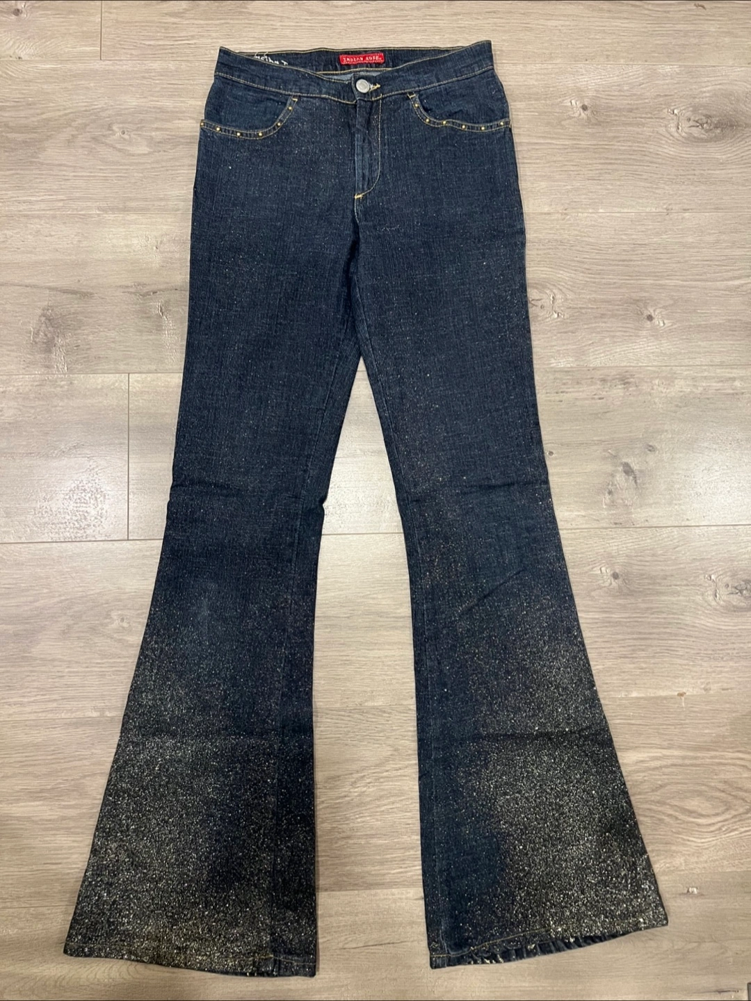 Y2K Dark wash denim with gold accents wide flare leg bottom. Gold embellishments. Size 26. Styled in Italy.