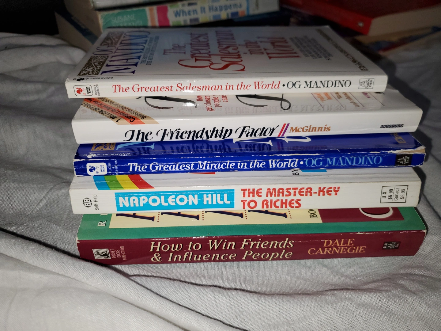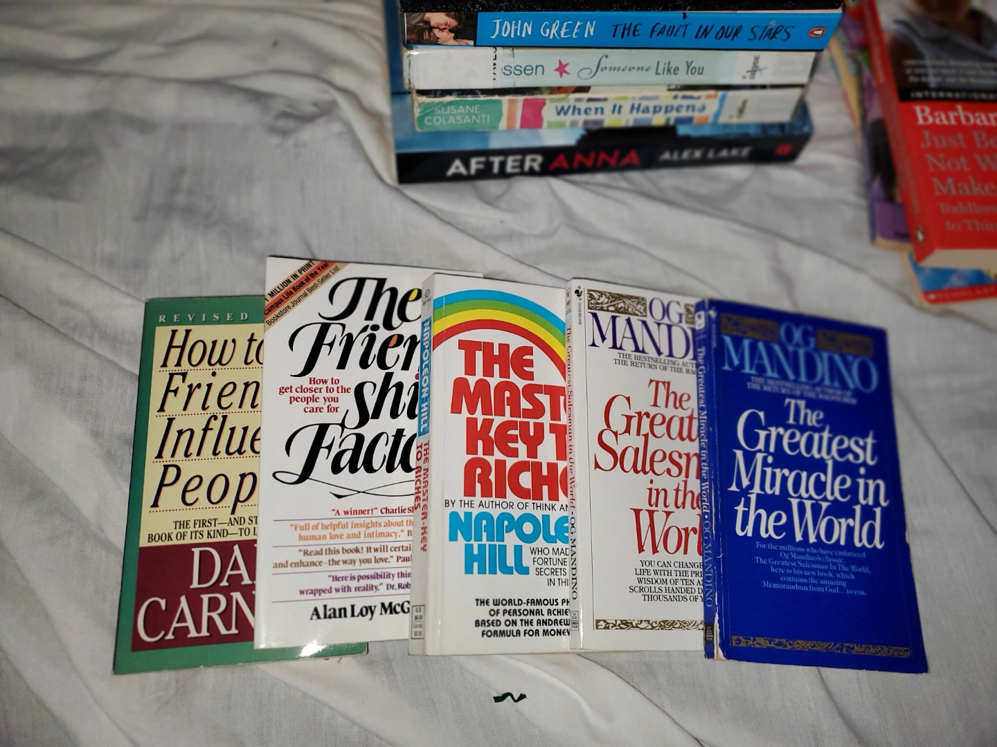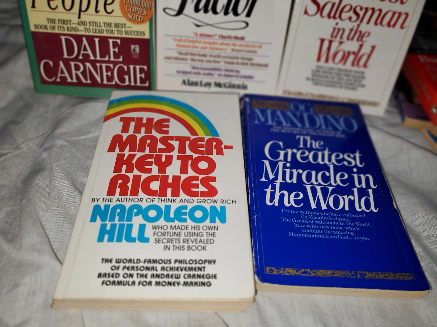 Collection of popular self-help books. Includes titles by Dale Carnegie, Napoleon Hill, and Og Mandino. Great for personal development or gifting. Various editions and conditions.