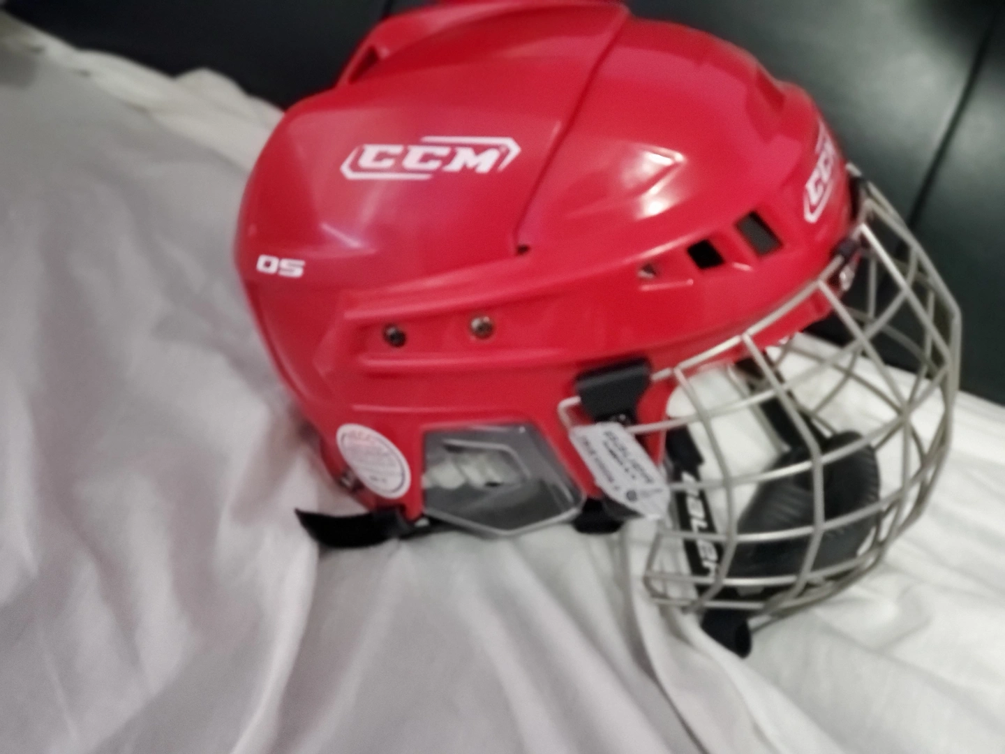 Red CCM hockey helmet. Includes a Bauer cage. Great for youth players.