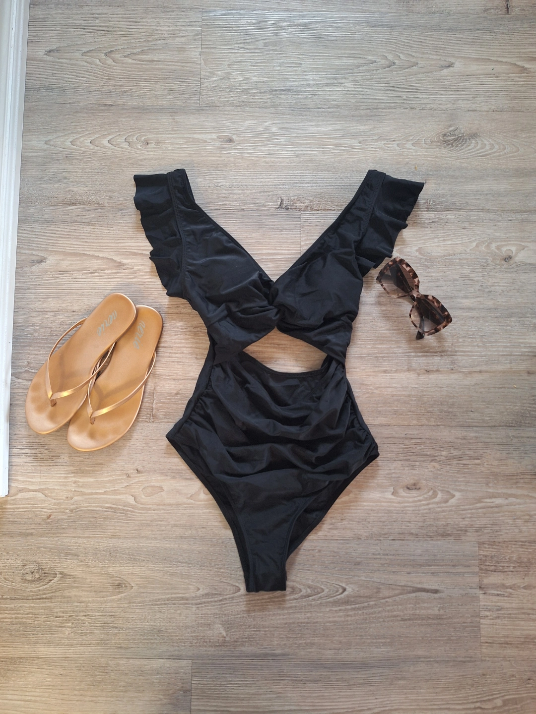 Stylish black one-piece swimsuit. Features ruffles on the shoulders and a cut-out detail at the waist. twisty detail in the front. sanitary sticker still attached as this is brand new, only tried on. I have too many bathing suits, I need to get rid of some!