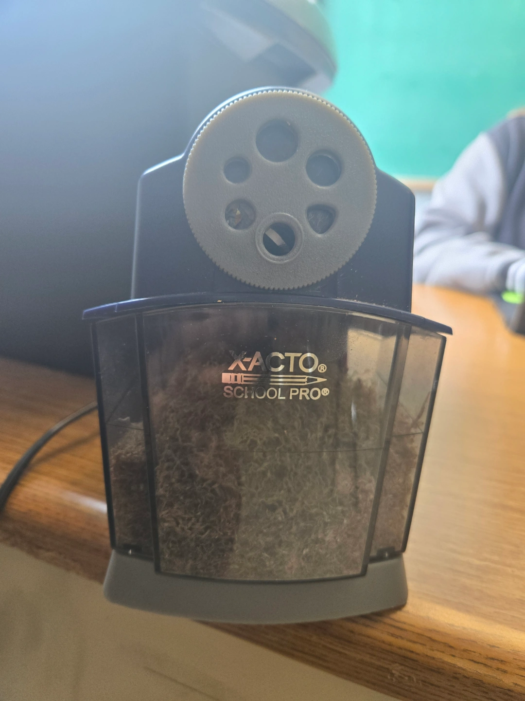 74Used pencil sharpener. Features a transparent shavings container. Multiple pencil size holes.