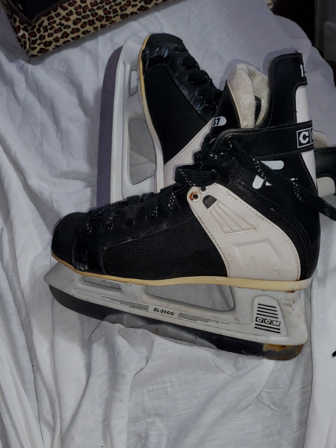 These are used CCM hockey skates, size 6. They have signs of wear but are still functional for recreational skating. Finding the perfect pair of skates is like finding a good parking spot downtown – rare and satisfying.
