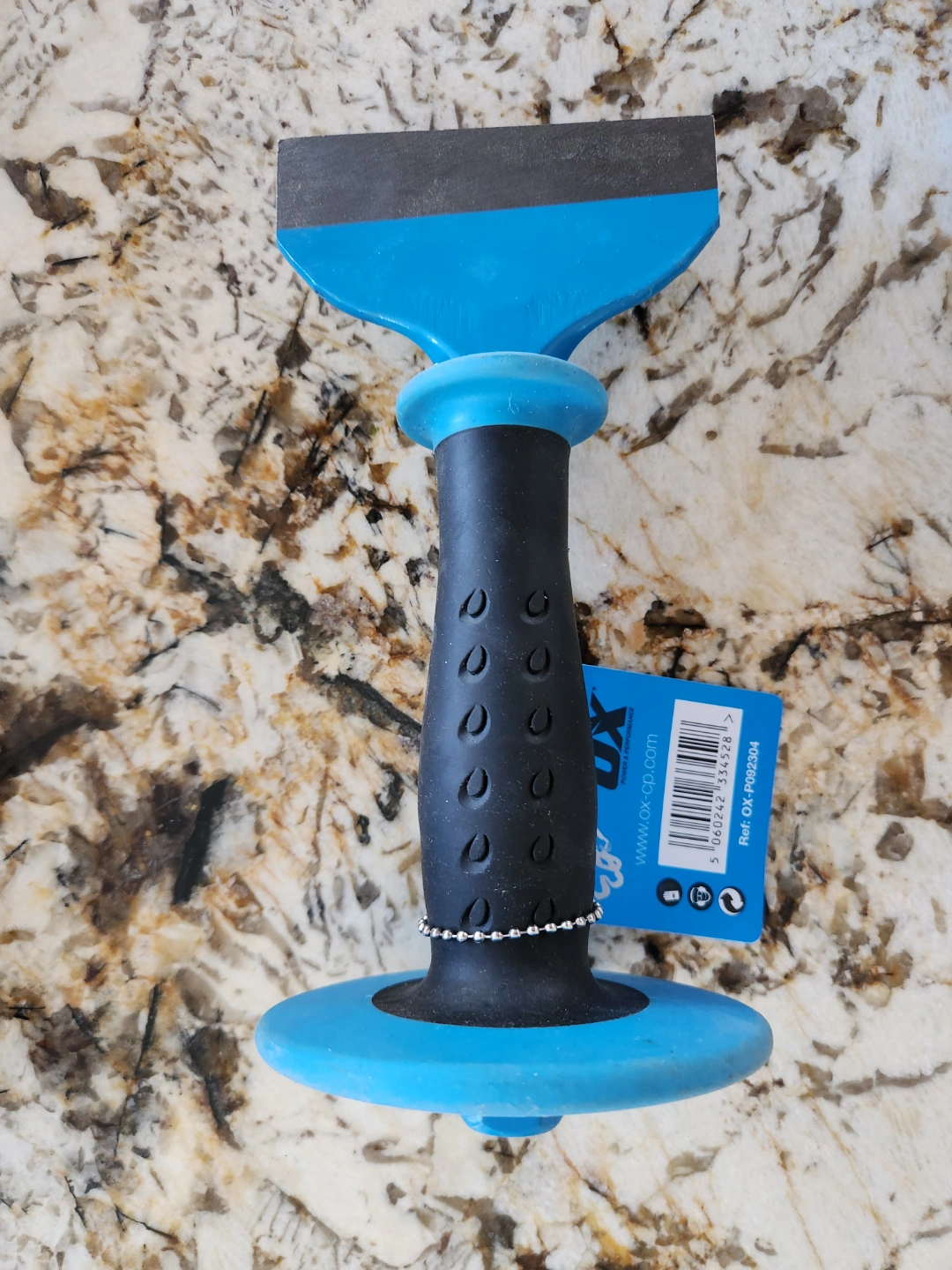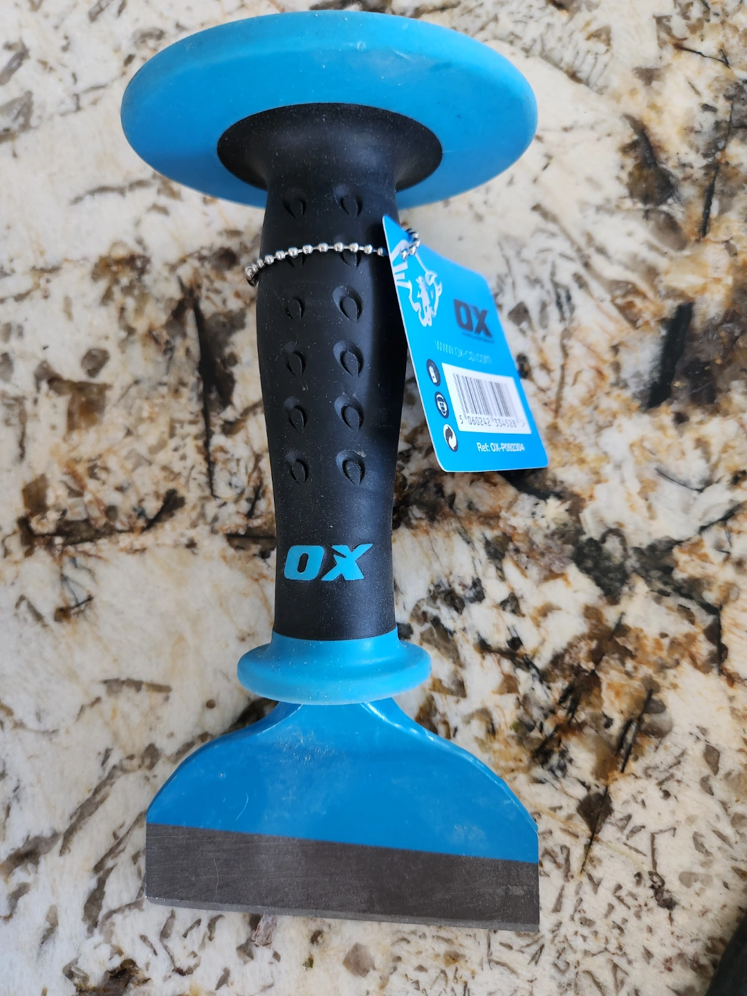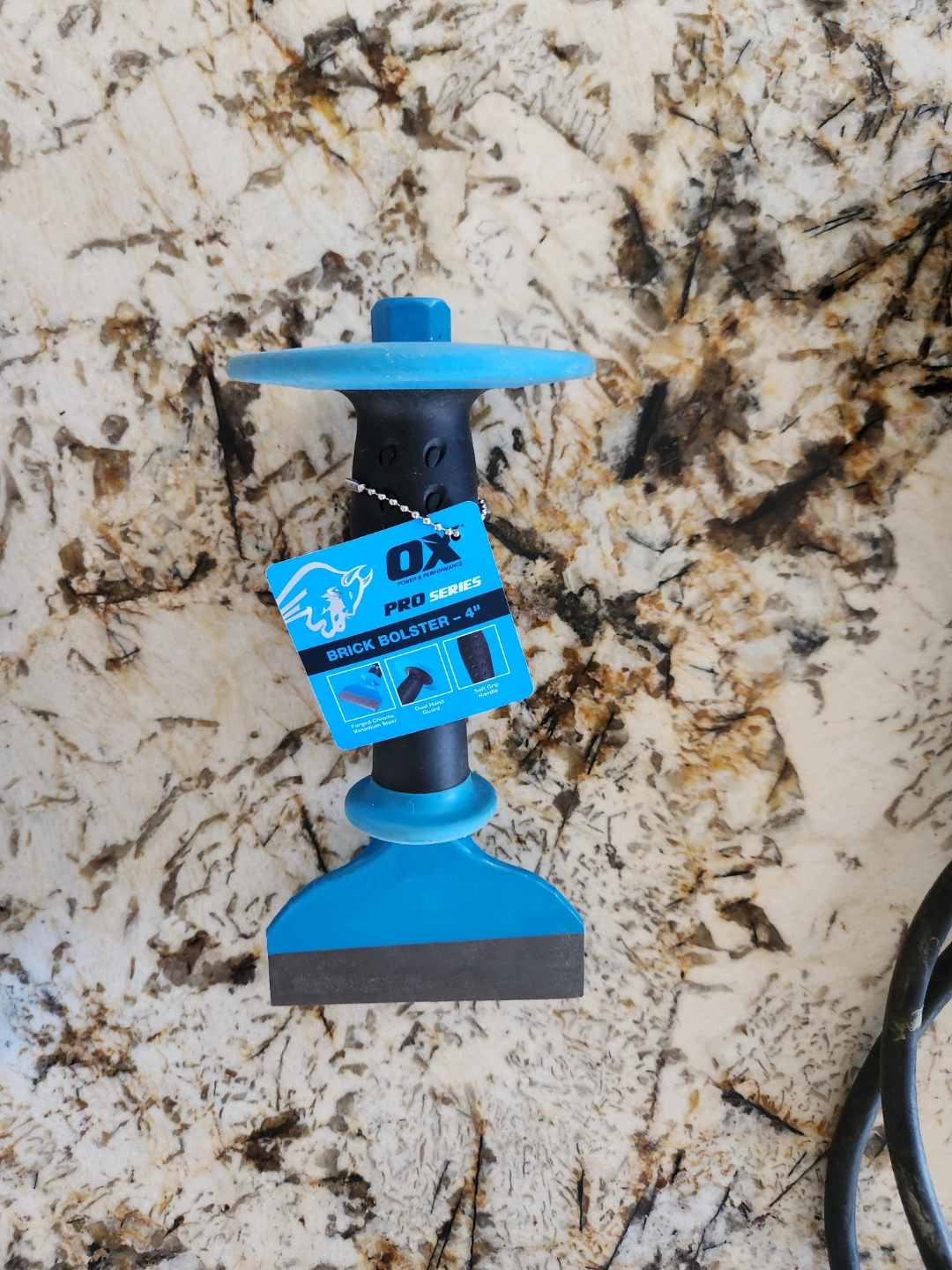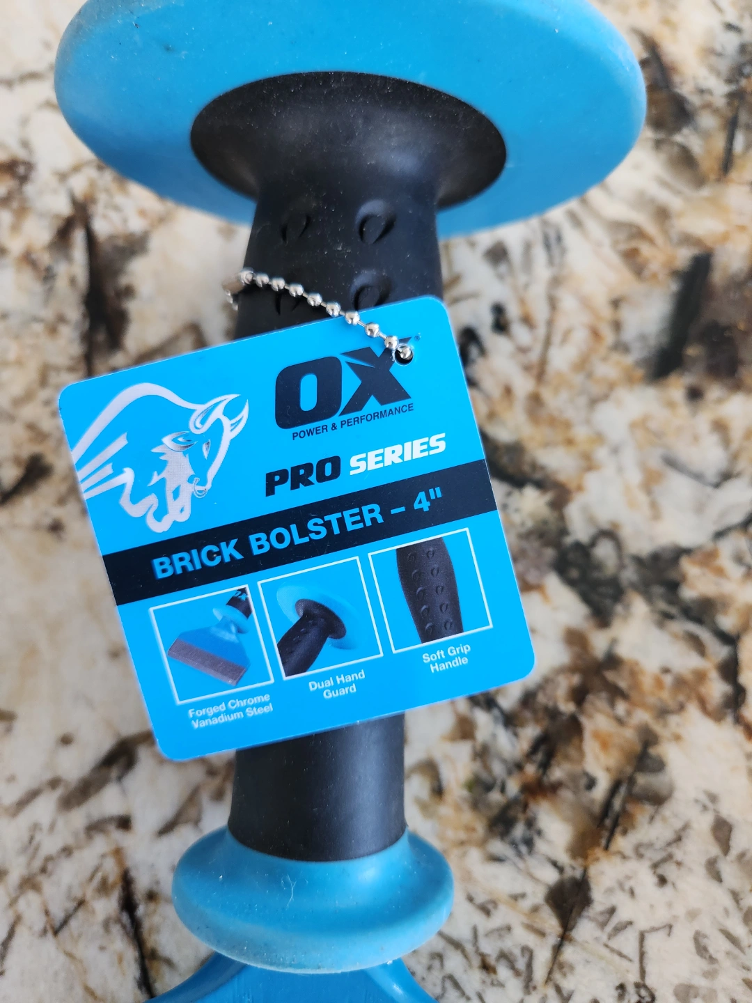 31New OX Pro Series brick bolster. 4" size. Features forged chrome vanadium steel, dual hand guard, and soft grip handle. Durable construction.
