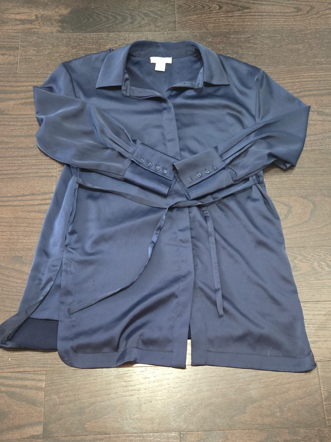 Long sleeve shirt dress. Navy blue satin material. Features a collared neckline, button front closure, and a tie waist. Side slits. Long sleeves with button cuffs.