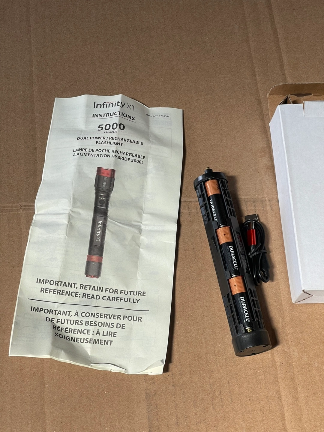 Dual power rechargeable flashlight. Includes instructions and Duracell batteries. New in box.