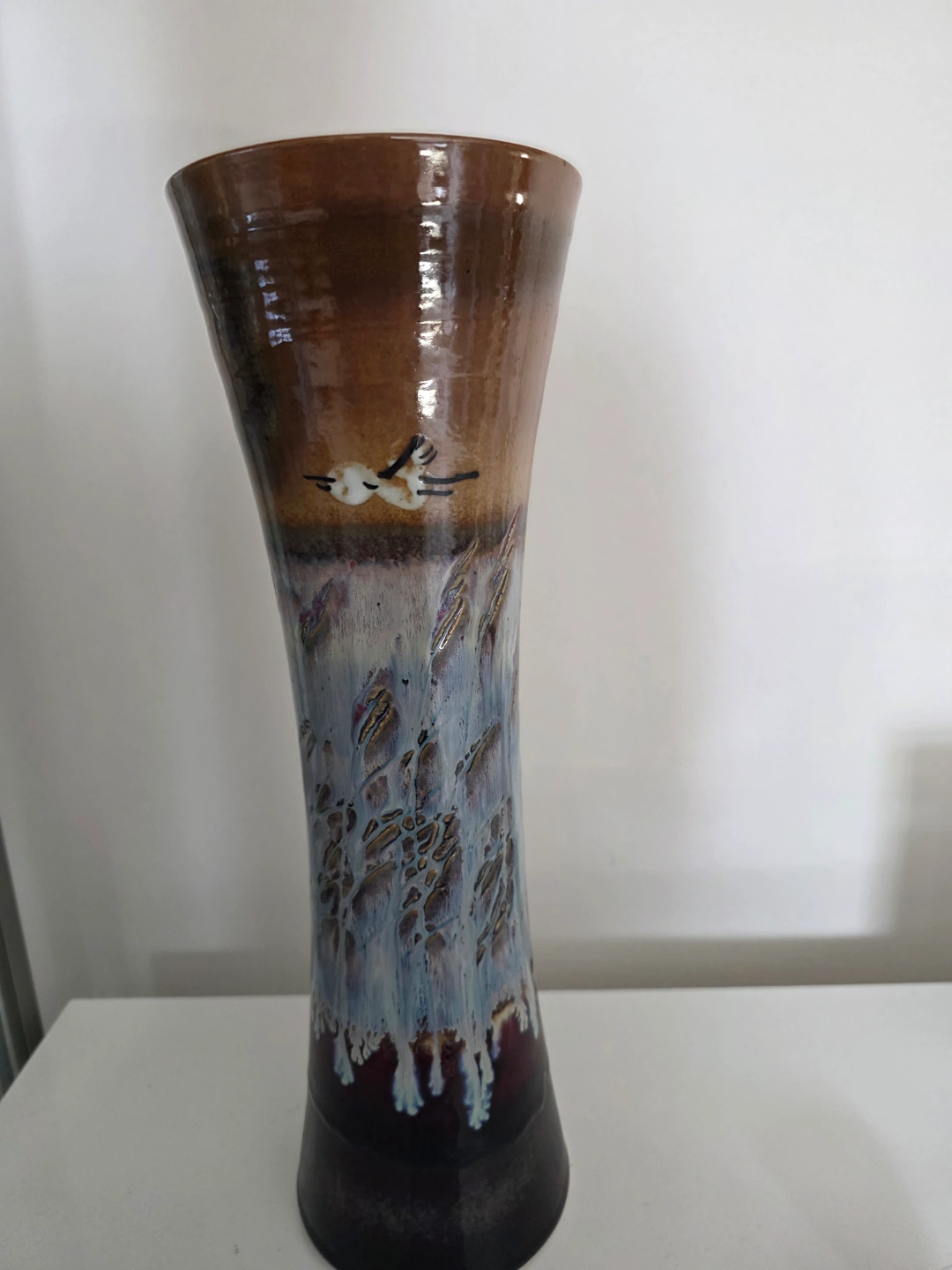 Beautiful handmade ceramic vase. Features a unique design. Tall and slender shape. Brown, purple, and blue glaze. Bird and floral accents.