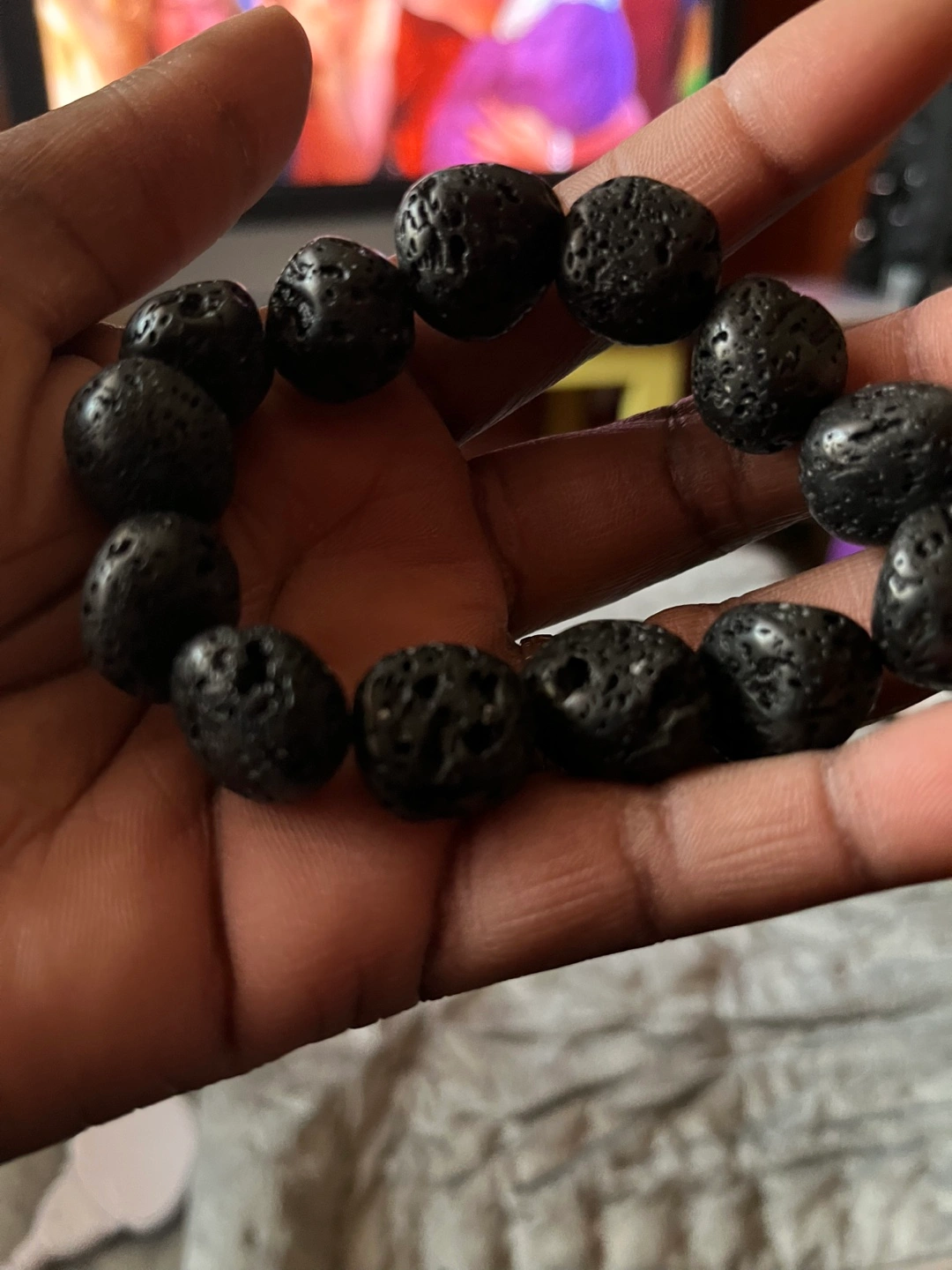 27Stretchy bracelet. Dark grey/black lava rock beads. Good for layering.