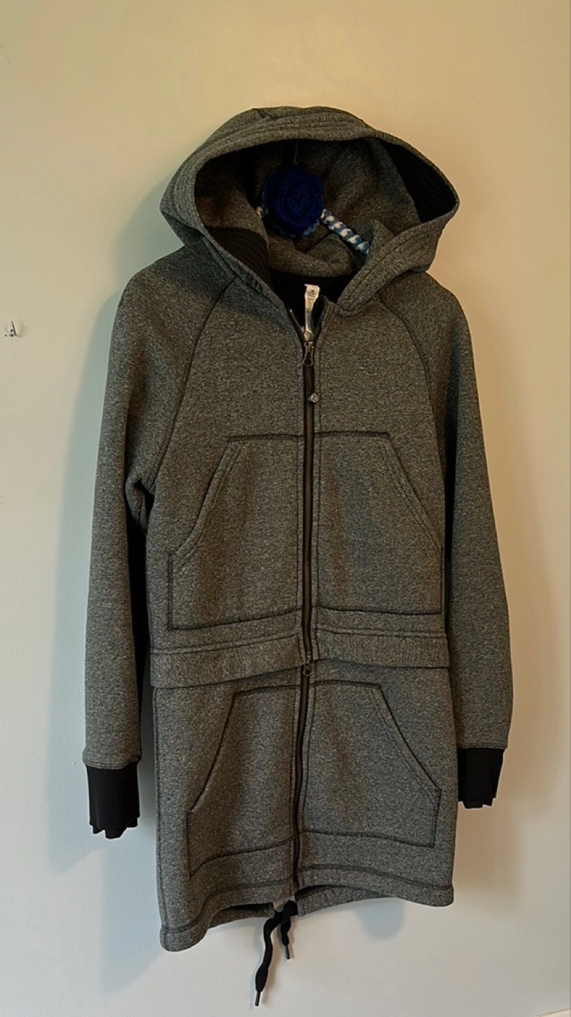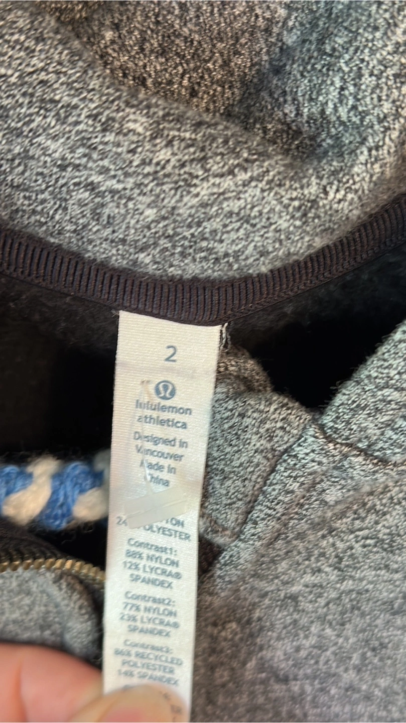 510Grey zip-up hoodie. Size 2. Features a hood, pockets, and ribbed cuffs. Lululemon athletic wear. Self pickup at Coquitlam Parkway Blvd
