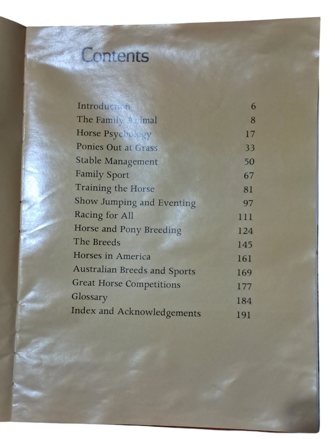 Vintage book about horses. Numerous colour photos and illustrations. Chapters cover horse psychology, stable management, training, showing, racing, breeding, and more. Covers horses in America and Australia. Includes glossary and index.