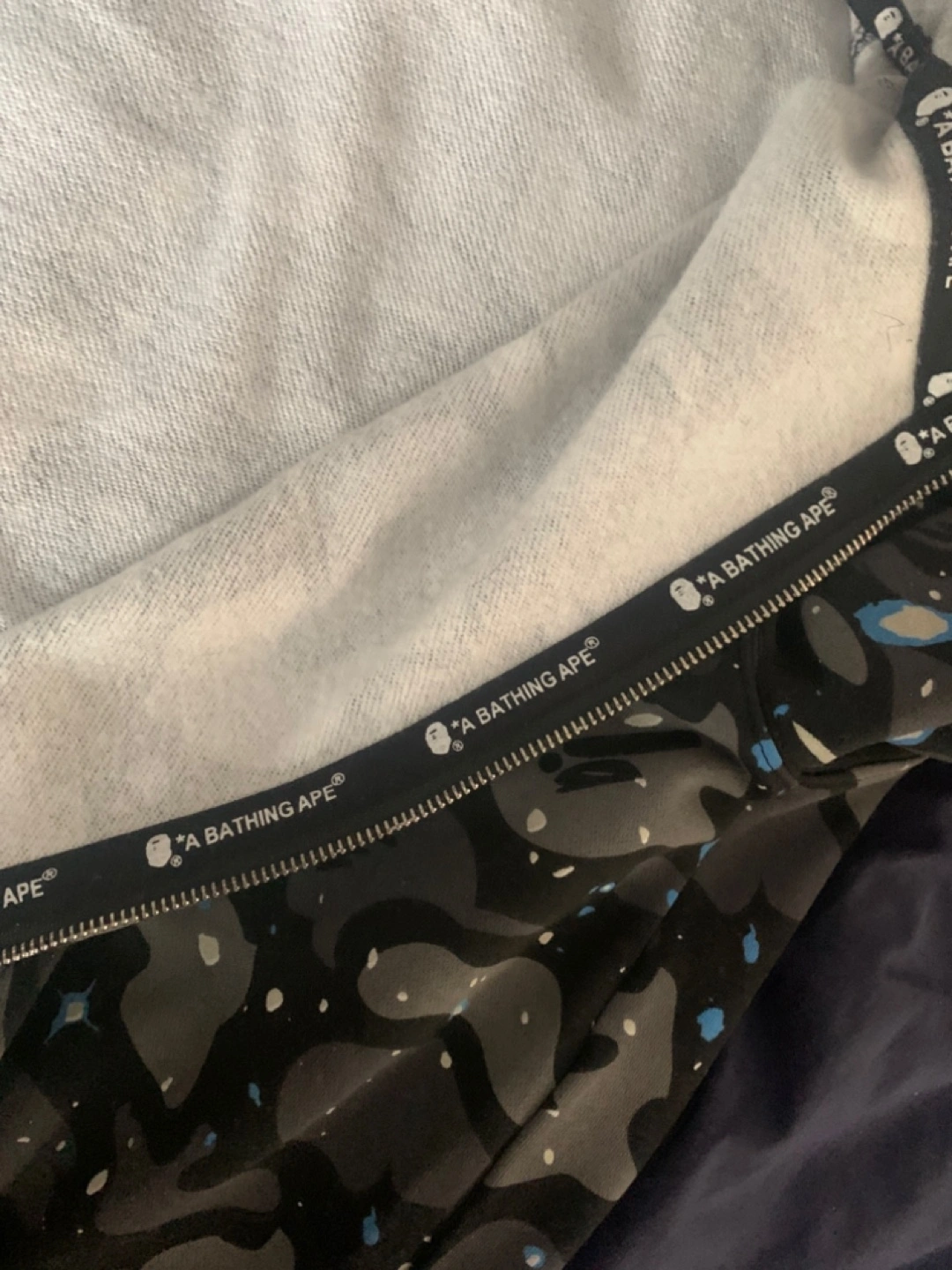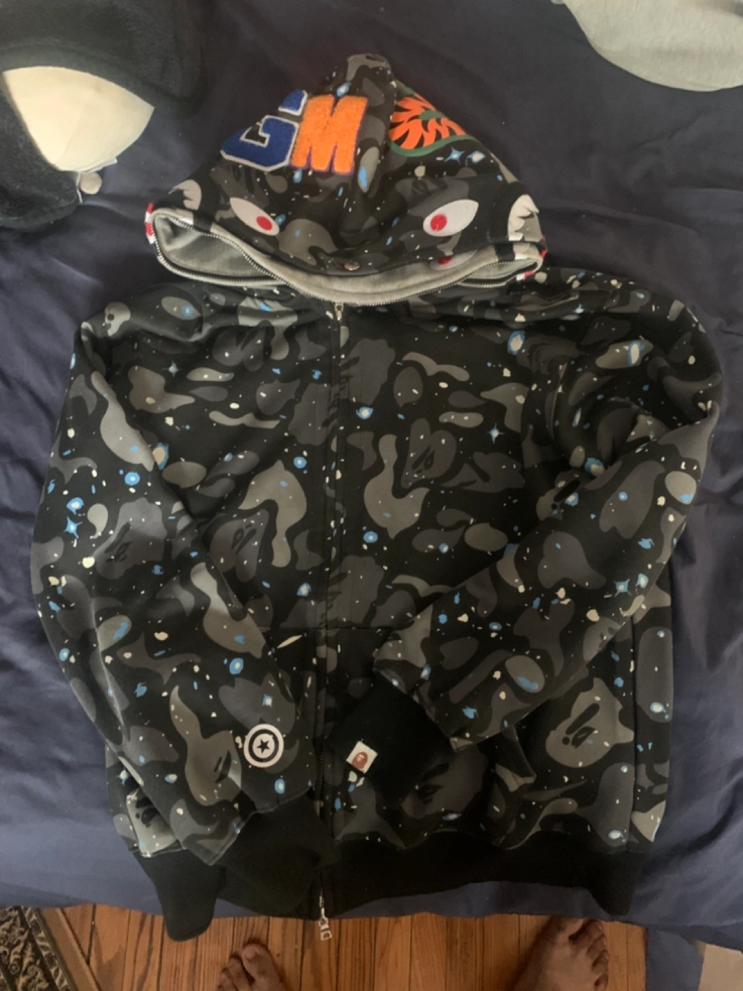 Men's A Bathing Ape zip-up hoodie. Features a shark design on the hood and a space camo pattern. WGM patch on the sleeve. Excellent condition.