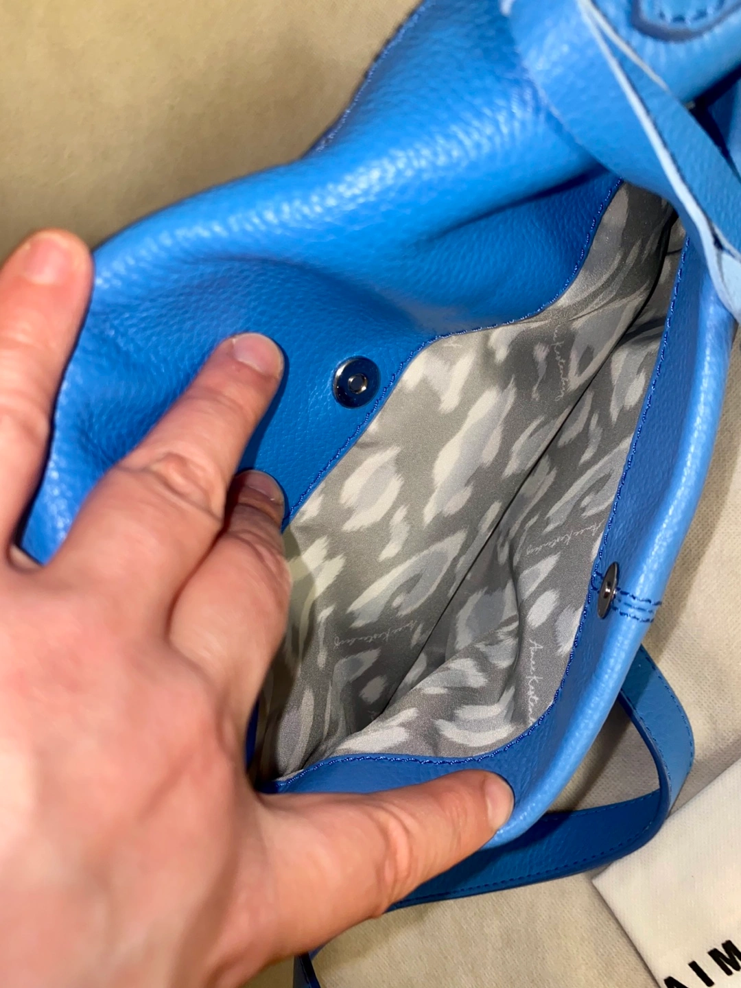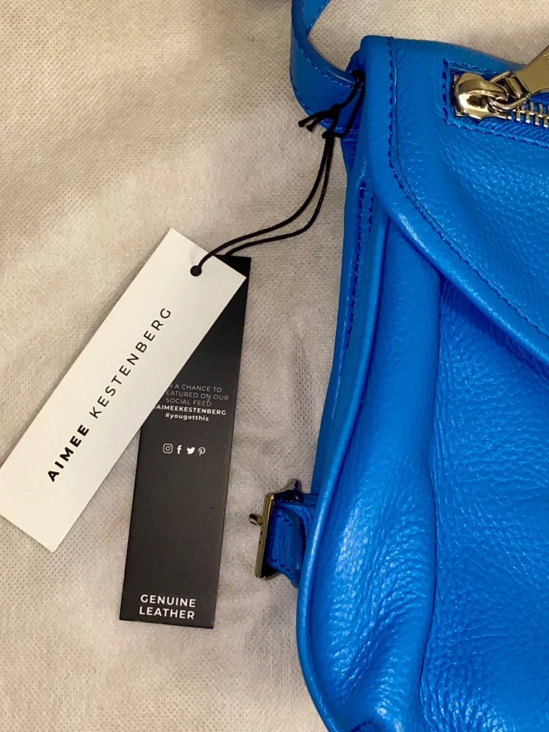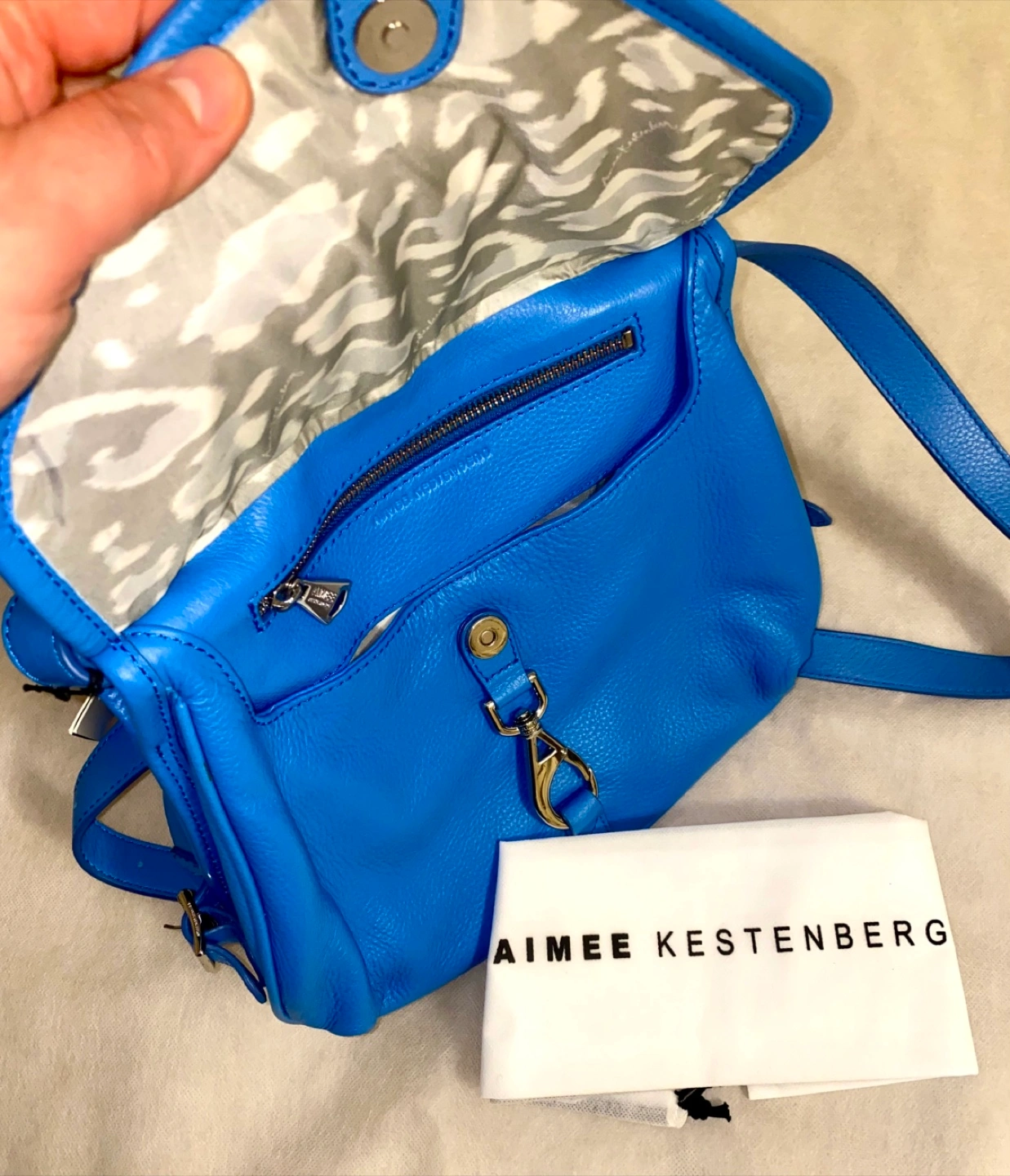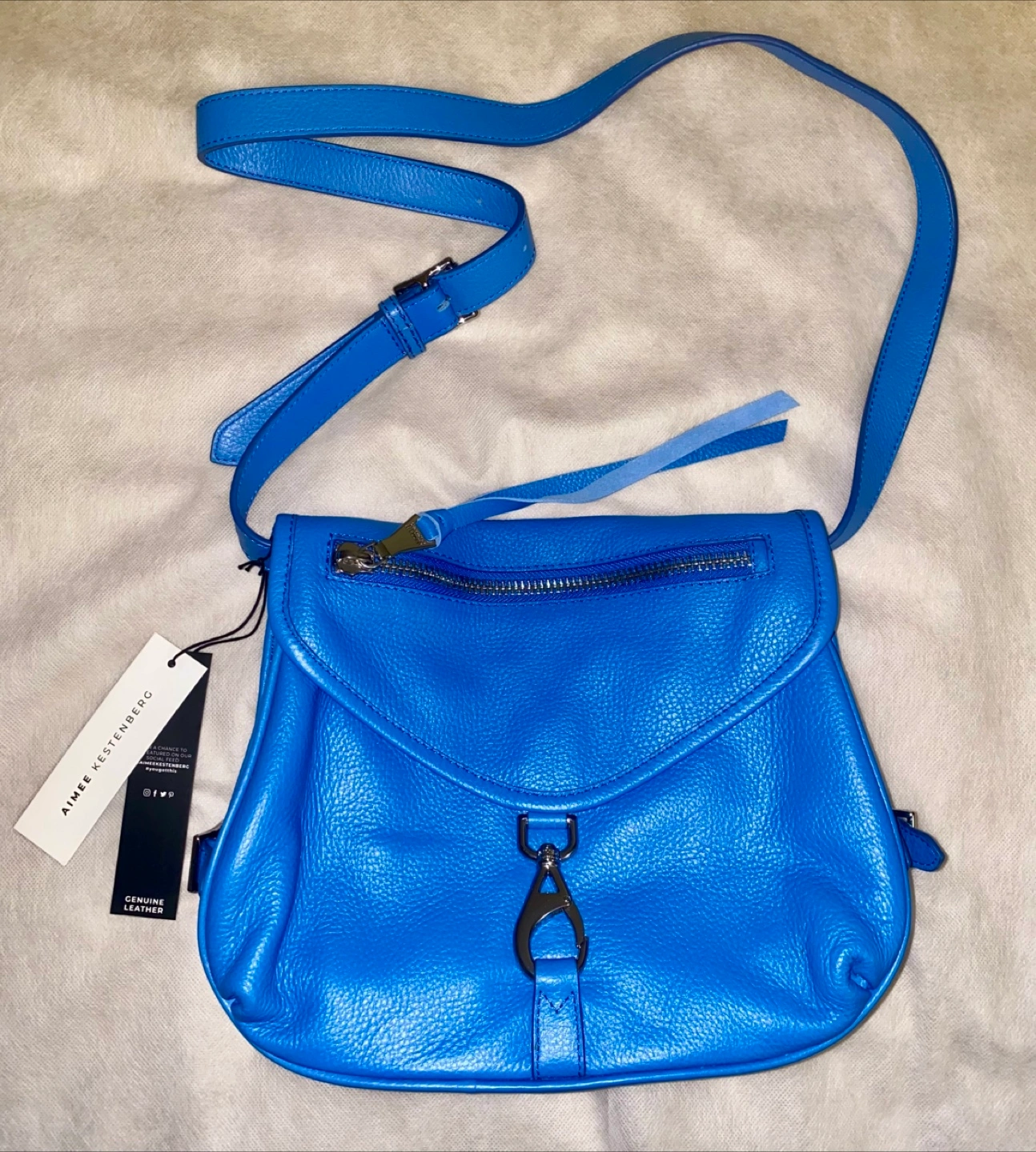 928Beautiful blue leather crossbody bag. Features a zipper closure and an adjustable strap. Genuine leather. Small interior pocket.
