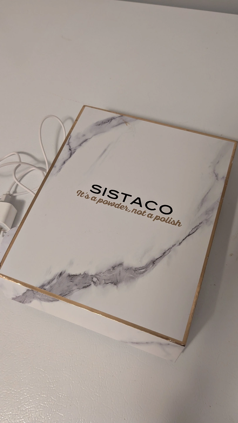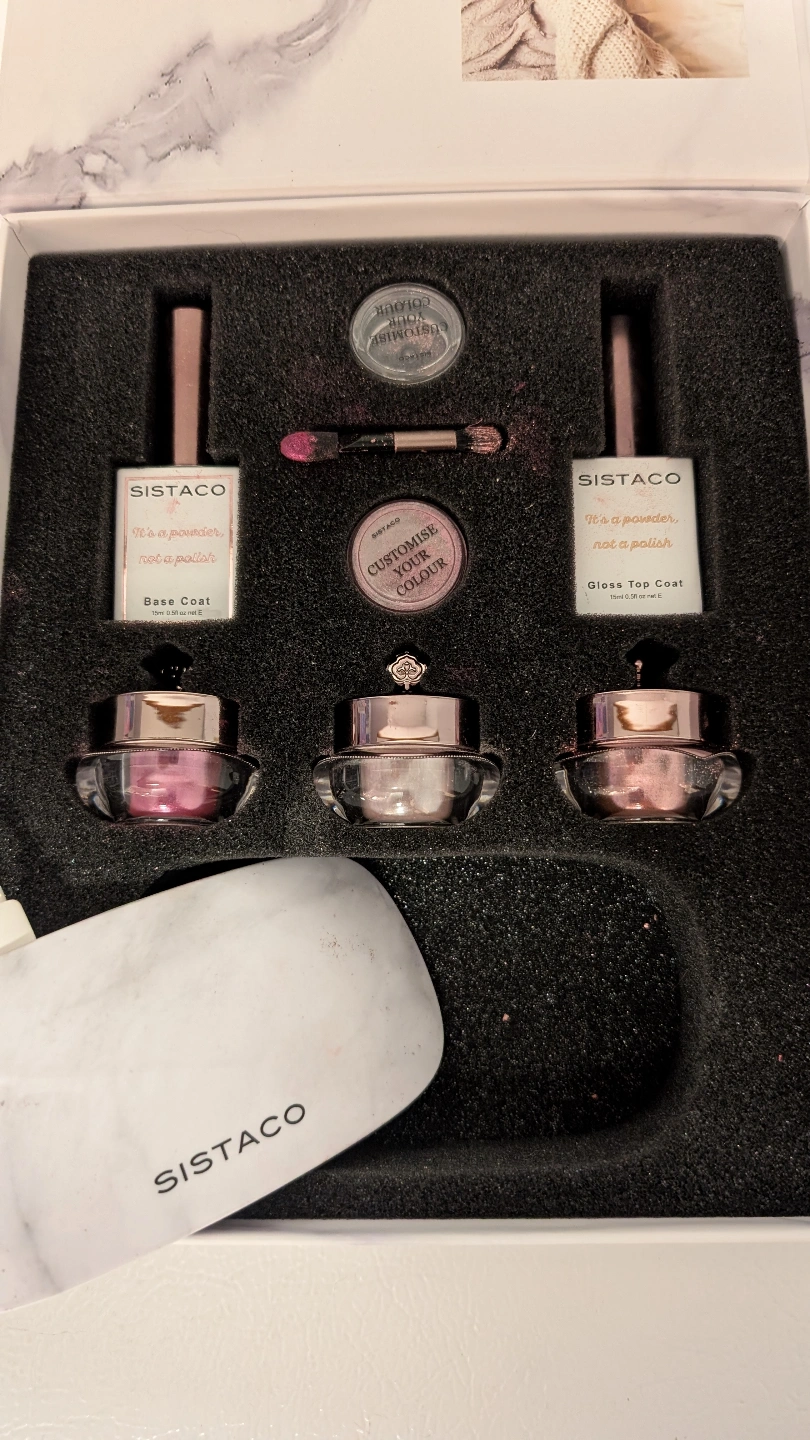 SISTACO nail powder kit. Includes three pink color powders and small UV lamp.