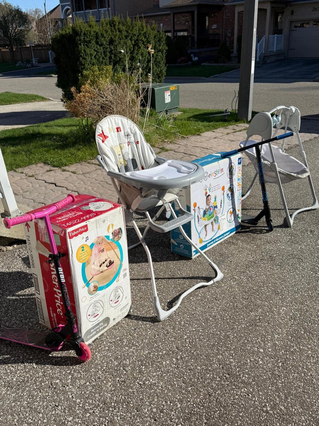 34Bundle includes a high chair, Baby Einstein jumper, baby swing, and a Razor scooter. Great for families with young children. Sold as is. All of them