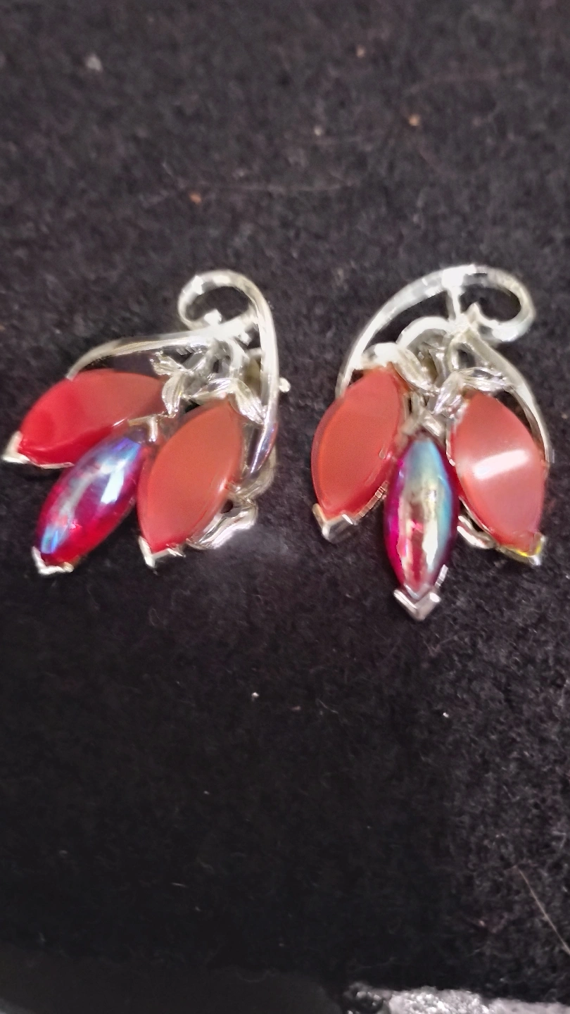 Pair of clip-on earrings. Features red stones and silver-tone metal. Unique design.