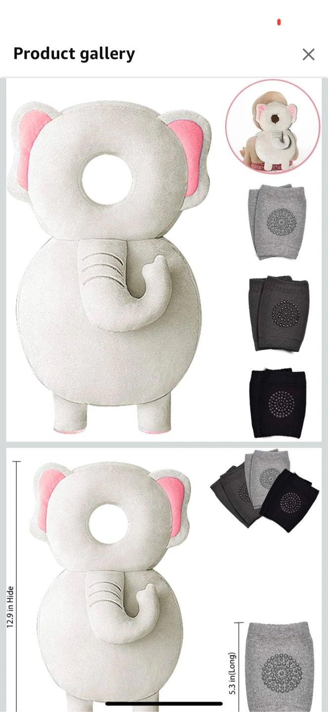 Adorable elephant-shaped baby head protection pillow. Set includes three pairs of baby knee pads in grey and black. Soft and comfortable materials. Perfect for protecting your little one while learning to walk.