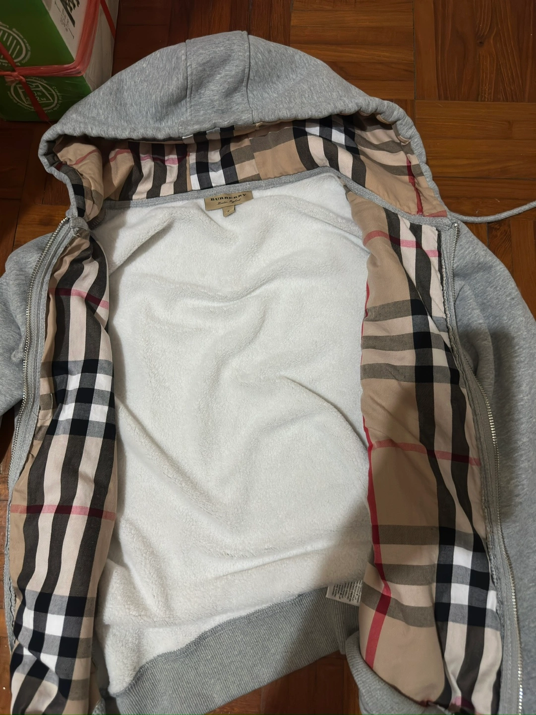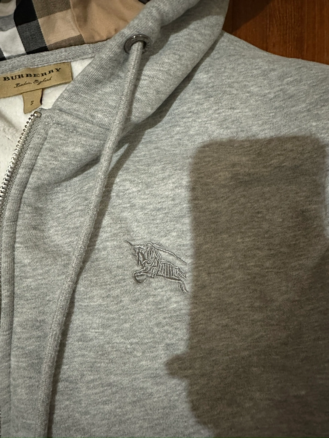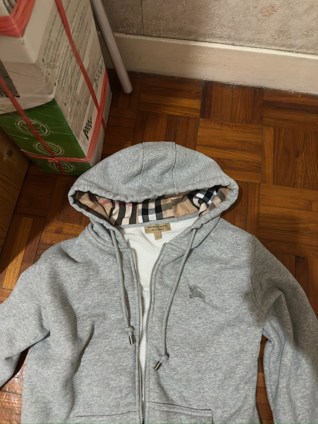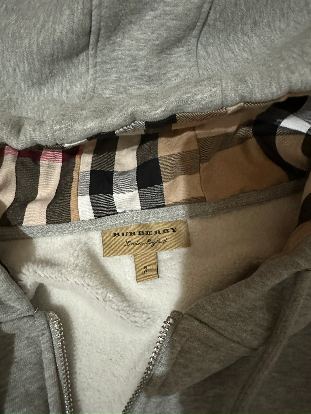 Grey zip-up hoodie. Features iconic Burberry check lining inside the hood. Embroidered Burberry logo on the chest. Size S.