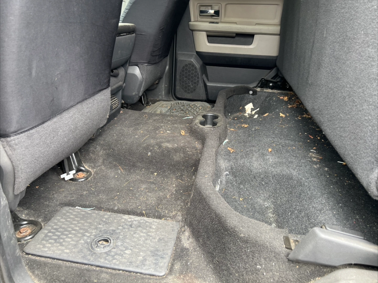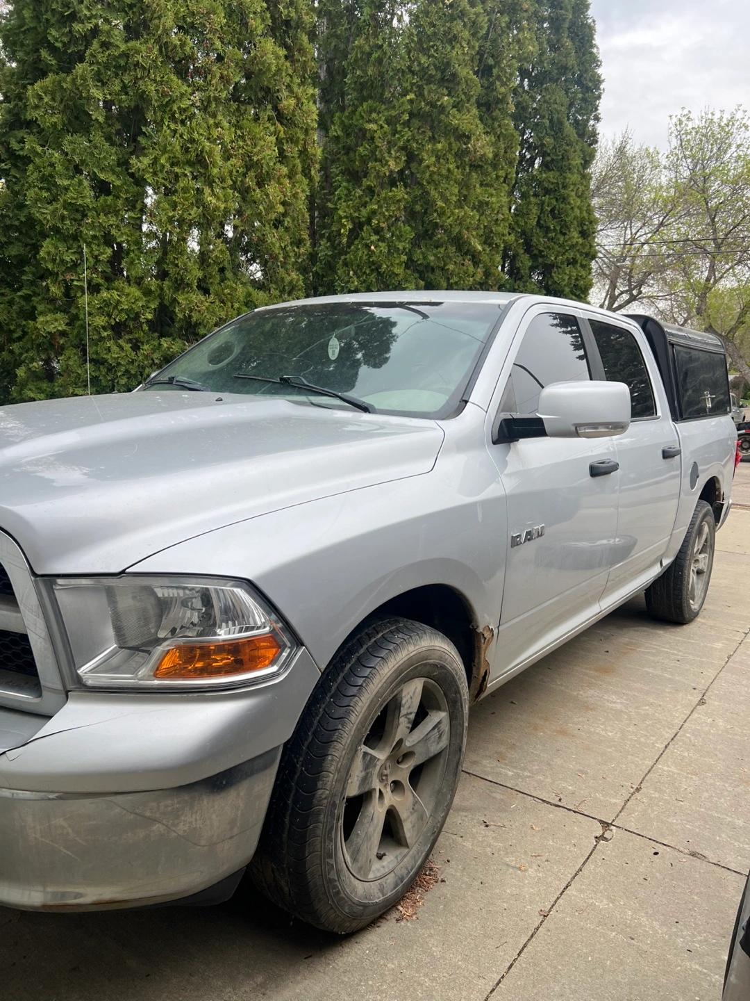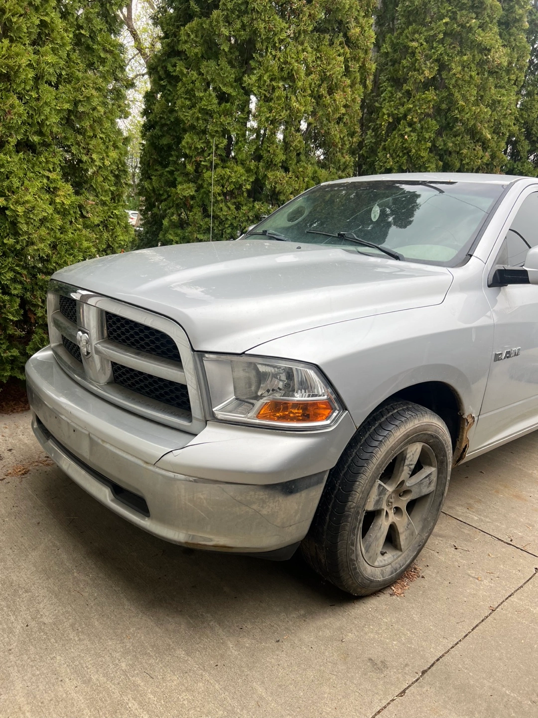 Silver Ram 1500 quad cab pickup truck. Features a black service body. Four doors. Needs some TLC. Sold as is.