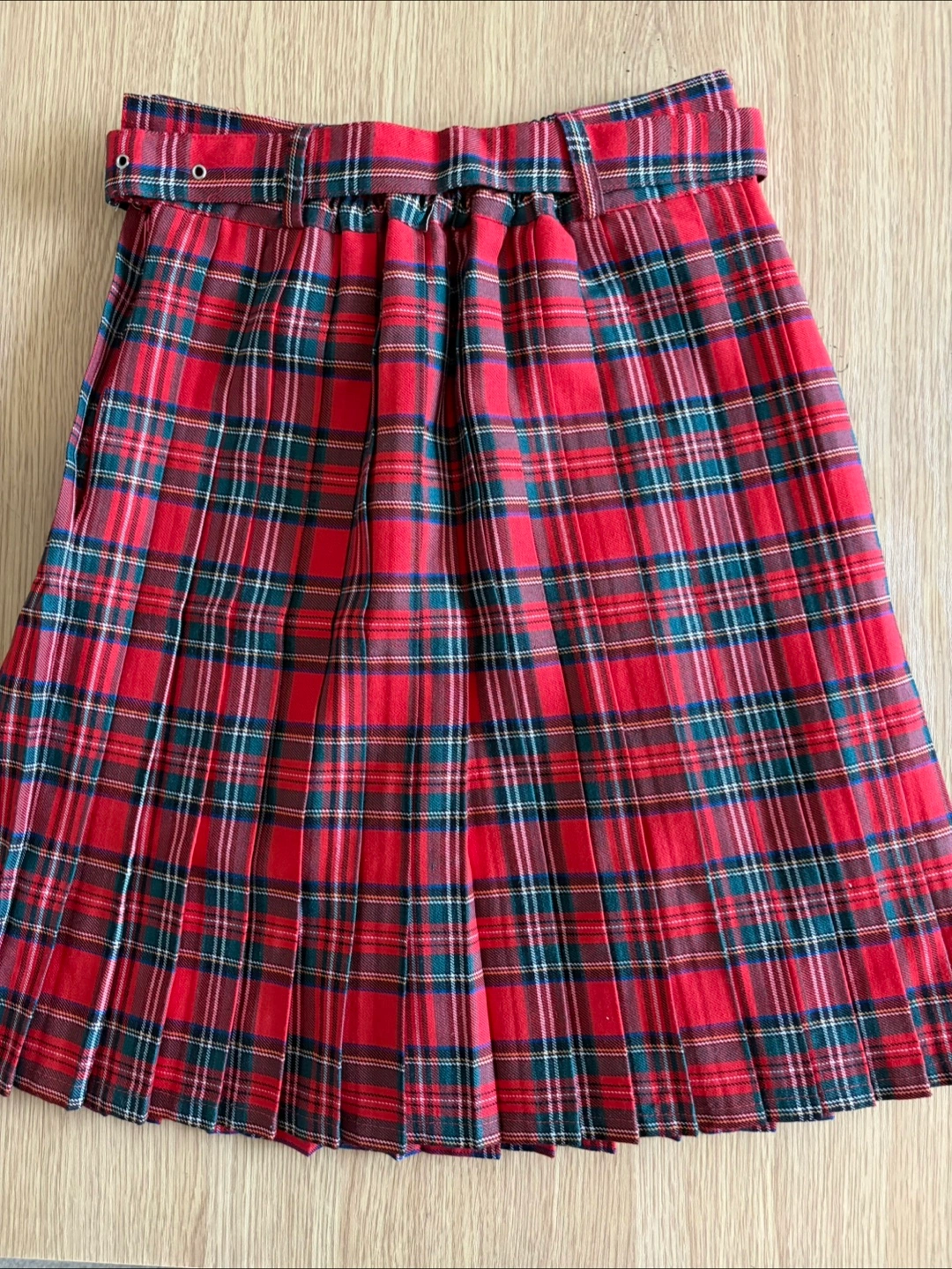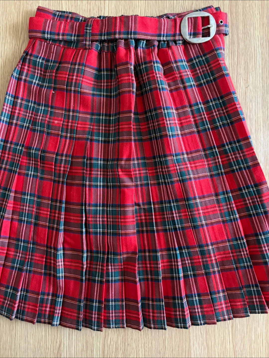 Pleaded kilt skirt. Features a red, green and white plaid pattern. Includes a matching fabric belt with a silver buckle. Red lining underneath. Great for a festive look or themed event. Waist 24” length 20”.